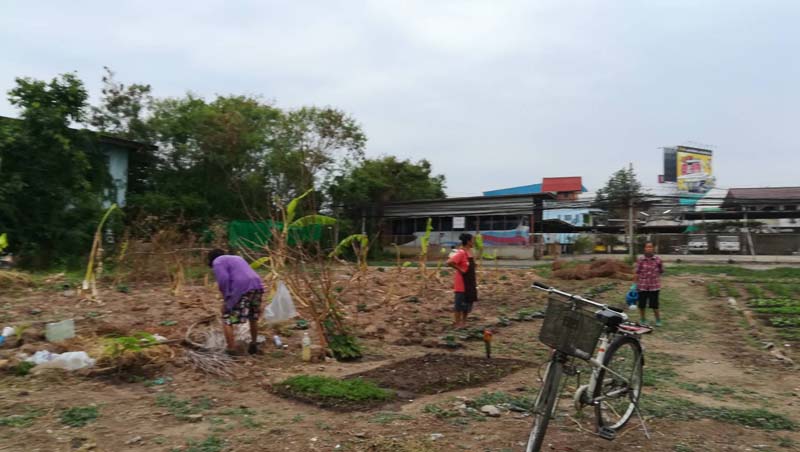 นางรัตนา นิ่มปากน้ำ อายุ 48 ปี ประกอบอาชีพรับจ้างพิมพ์งาน โรงพิมพ์วิมลการพิมพ์ เปิดเผยว่า ประมาณ 1 เดือนที่ผ่านมา เจ้าของที่คือเฮียชัย อยู่กทม. เขาอนุญาตให้ชาวบ้านมาใช้พื้นที่ได้ เดิมเป็นที่รกร้างว่างเปล่า เจ้าของที่บอกช่วงนี้ไม่มีอะไรทำก็ให้มาปลูกผักกินกันได้ เริ่มมาปรับที่ดินประมาณ 1 เดือนแล้ว ใครอยากได้ตรงไหนก็จับจองเอาเอง ถางหญ้า ปรับแปลง มีชาวบ้านละแวกนี้ 9 ราย มาลงมือปลูก ทุกเช้า-เย็นก็จะมาช่วยกันรดน้ำพรวนดิน