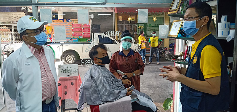 ขณะที่ นายวิทยา เขียวรอด นายอำเภอเมืองนครศรีธรรมราชพร้อมด้วยนายไสว เขียวจันทร์ รองนายกเทศมนตรีนครศรีธรรมราช พร้อม จนท.สาธารณสุขเทศบาลฯ ได้เดินทางไปตรวจการเปิดบริการตัดผมบริเวณย่านร้านตัดผมบวรพลาซ่า ริมถนนราชดำเนิน ต.ท่าวัง อ.เมืองนครศรีธรรมราช ซึ่งเป็นย่านตัดผมสำคัญใจกลางเมืองที่มีคนมาใช้บริการตัดผมเป็นจำนวนมากทุกวัน มีร้านตัดผมเปิดติดกันจำนวน 3 ร้าน คือร้านบวรบาร์เบอร์, สันซาลอน, ท่าวังบาร์เบอร์