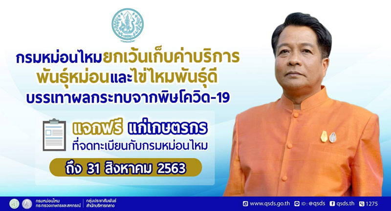 กรมหม่อนไหมออกประกาศยกเว้นการเก็บค่าบริการพันธุ์หม่อนและไข่ไหมพันธุ์ดี เพื่อบรรเทาผลกระทบจากการแพร่ระบาดของเชื้อไวรัสโควิด-19 โดยแจกพันธุ์หม่อนไม่เกินรายละ 10,000 ท่อน และไข่ไหมพันธุ์ดีไม่เกินรายละ 5 แผ่น ฟรี ภายใน 31 สิงหาคมนี้ แก่เกษตรกรที่จดทะเบียนกับกรมหม่อนไหม