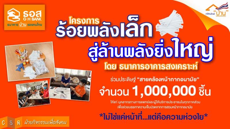 ธนาคารอาคารสงเคราะห์ ธนาคารบ้านของคนไทย เปิดตัวโครงการ “ร้อยพลังเล็ก สู่ล้านพลังยิ่งใหญ่ โดยธอส.” ร่วมประดิษฐ์สายคล้องหน้ากากอนามัย จำนวน 1,000,000 ชิ้น โดยแบ่งเป็นผู้บริหาร ผู้ปฏิบัติงานของ ธอส. และหน่วยงานพันธมิตร จำนวน 600,000 ชิ้น ผู้สูงอายุ/ผู้พิการในความดูแลของกระทรวงการพัฒนาสังคมและความมั่นคงของมนุษย์ และกลุ่มผู้สูงอายุในชุมชนที่ธนาคารสนับสนุน จำนวน 400,000 ชิ้น ภายใน 1 เดือน ระหว่างวันที่ 15 พฤษภาคม - 15 มิถุนายน 2563 หวังบรรเทาความเจ็บจากการกดทับของสายหน้ากากอนามัยเมื่อใส่เป็นเวลานานให้กับบุคลากรทางการแพทย์ และทุกสาขาอาชีพที่ปฏิบัติหน้าที่ดูแลประชาชนในช่วงสถานการณ์การระบาดของเชื้อไวรัสโคโรนา 2019