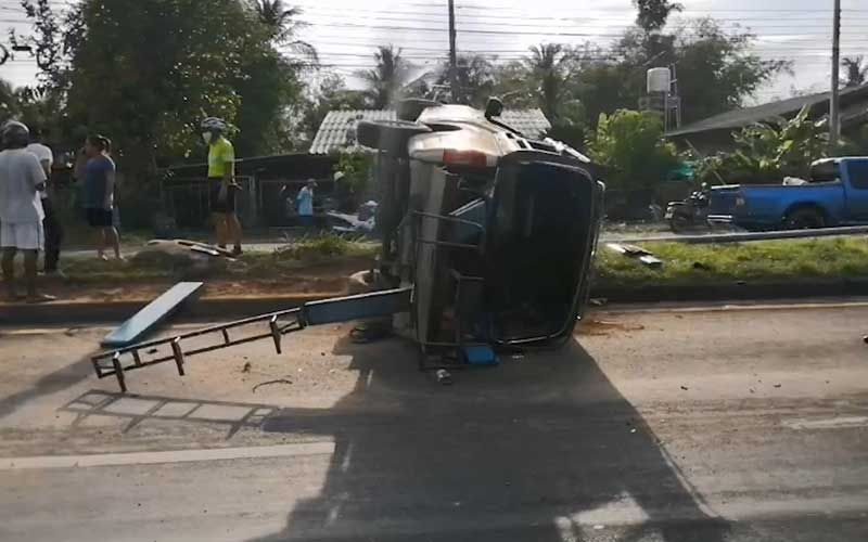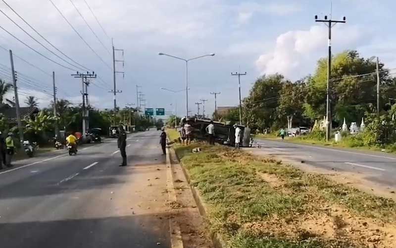 รถกระบะบรรทุกคนงานมาเต็มคันรถยางระเบิดพลิกคว่ำกลางถนนสายระโนด-สงขลา คนงานบาดเจ็บทั้งคัน 12 คน แต่ไม่มีใครเสียชีวิต