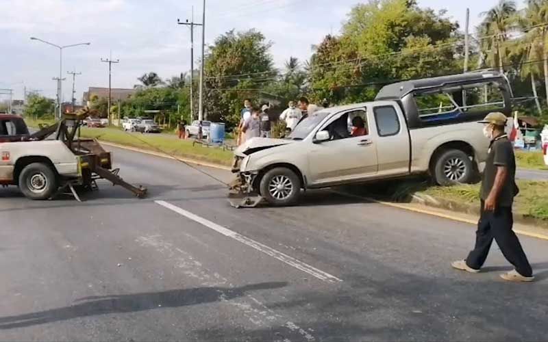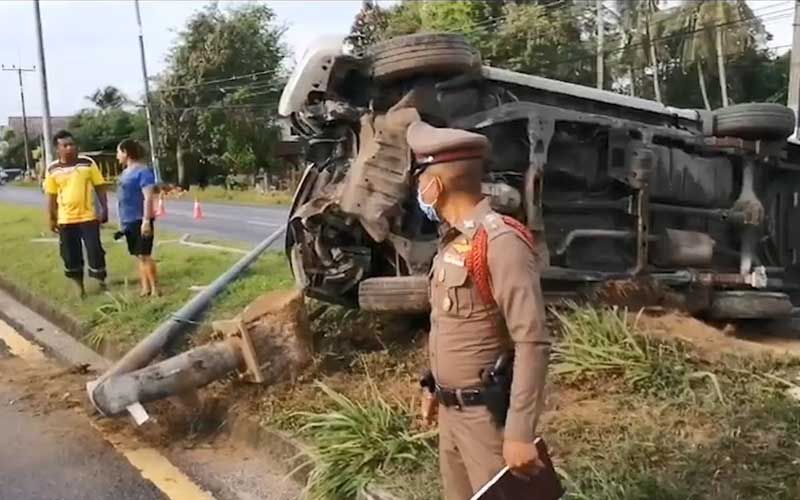 เมื่อช่วงเช้าวันที่ 16 พ.ค.63 ที่ผ่านมา ร.ต.อ.เกียรติ พีรฉัตรปกรณ์ รองสารวัตรสอบสวน สภ.ม่วงงาม อ.สิงหนคร จ.สงขลา ได้รับแจ้งเกิดอุบัติเหตุรถกระบะบรรทุกคนงานพลิกคว่ำ บนถนนสายระโนด-สงขลา พื้นที่หมู่8 ต.ม่วงงาม อ.สิงหนคร จ.สงขลา ไปตรวจสอบที่เกิดเหตุพร้อมหน่วยกู้ชีพม่วงงามพบรถกระบะยี่ห้ออีซูซุ สีบรอนซ์ ตอนครึ่ง หมายเลขทะเบียน นข 8828 สงขลา กระบะท้ายมีหลังคาเหมือนรถสองแถว พลิกตะข้างอยู่บนเกาะกลางถนน ยางล้อหลังด้านขวาระเบิดและยังชนเสาไฟฟ้าส่องทางหักโค่น 1 ต้น ทำให้คนงานที่นั่งมาในรถทั้งกระบะท้ายและในห้องโดยสารบาดเจ็บยกคัน 12 คน เป็นผู้หญิงทั้งหมด บางคนกระเด็นตกจากรถ แต่อาการไม่สาหัสร่างกายบอบช้ำจากแรงกระแทก หน่วยกู้ชีพม่วงงามช่วยนำส่งโรงพยาบาลสทิงพระ