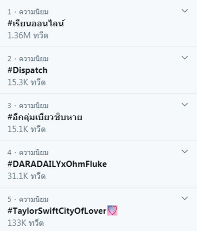ล่าสุด #เรียนออนไลน์ ขึ้นเป็นอันดับ 1 ของเทรนด์ทวิตเตอร์ตั้งแต่ช่วงเช้า หลังโลกออไลน์ทั้งนักเรียน และผู้ปกครอง แสดงความคิดเห็นเกี่ยวกับปัญหาของการเรียนออนไลน์วันแรก เช่น ไม่มีใบงาน หรืออุปกรณ์การเรียนรู้ สื่อการสอนไม่เหมาะสม ปัญหาทางเทคนิคของอุปกรณ์ที่ใช้ จดเนื้อหาการเรียนไม่ทัน