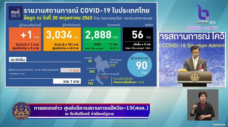 เมื่อเวลา 11.30 น. ที่ทำเนียบรัฐบาล นพ.ทวีศิลป์ วิษณุโยธิน โฆษกศูนย์บริหารสถานการณ์การแพร่ระบาดโรคติดเชื้อไวรัสโคโรน่า 2019 (โควิด-19) หรือ ศบค. แถลงว่า สถานการณ์การแพร่ระบาดในประเทศไทย มีผู้ป่วยรายใหม่ 1 ราย เป็นชายไทย อายุ 45 ปี อาชีพเชฟที่บาห์เรน พบในโรงแรมซึ่งเป็นสถานที่กักตัวของรัฐที่ กทม. เดินทางกลับมาจากบาห์เรนเมื่อวันที่ 15 พ.ค. ตรวจพบเชื้อเมื่อวันที่ 18 พ.ค. เป็นผู้ป่วยที่ไม่แสดงอาการ แต่มาจากระบบการตรวจเชื้อของผู้ที่เดินทางมาจากต่างประเทศ เป็นมาตรฐานที่เราวางไว้อยู่แล้ว ทำให้ยอดผู้ป่วยสะสมอยู่ที่ 3,034 ราย หายป่วยสะสม 2,888 ราย อยู่ระหว่างรักษา 90 ราย ไม่มีรายงานผู้เสียชีวิตเพิ่มเติม ทำให้ยอดผู้เสียชีวิตยังคงอยู่ที่ 56 ราย