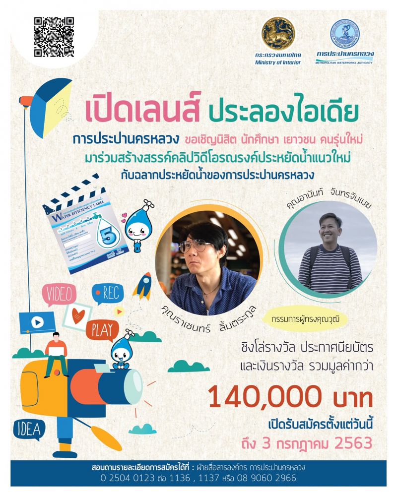 นางชวิณา วิรัตน์โยสินทร์ ผู้อำนวยการฝ่ายสื่อสารองค์กร การประปานครหลวง (กปน.) เปิดเผยว่า กปน. ขอเชิญนิสิต นักศึกษา ระดับอุดมศึกษา ร่วมประกวดสร้างสรรค์คลิปวิดีโอรณรงค์ประหยัดน้ำแนวใหม่ โดยการใช้อุปกรณ์ประหยัดน้ำ ที่ได้รับการรับรอง “ฉลากประหยัดน้ำของ กปน.” เพื่อให้เยาวชน หรือประชาชนทั่วไปเกิดการรับรู้ เข้าใจและตระหนักถึงความสำคัญของการเลือกใช้อุปกรณ์ประหยัดน้ำ เพื่อปลูกจิตสำนึกการรณรงค์การใช้น้ำอย่างรู้คุณค่าขยายในวงกว้าง นำไปปฏิบัติในชีวิตประจำวันอย่างเป็นรูปธรรม และมีส่วนร่วมในการช่วยกันประหยัดน้ำเพื่อรองรับภาวะภัยแล้งในอนาคต