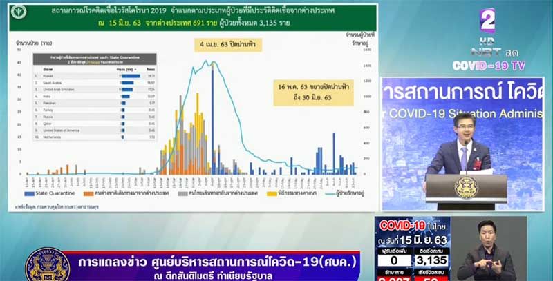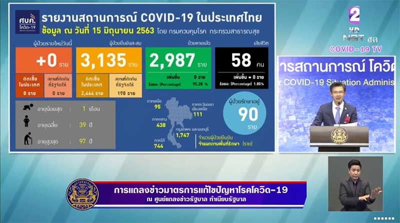 วันที่ 15 มิถุนายน 2563 นพ.ทวีศิลป์ วิษณุโยธิน โฆษกศูนย์บริหารสถานการณ์การแพร่ระบาดของโรคติดเชื้อไวรัสโคโรนา 2019 (โควิด-19) หรือ ศบค.แถลงสถานการณ์ประจำวัน วันนี้ไม่มีผู้ติดเชื้อในประเทศ รวมผู้ป่วยยืนยันสะสม 3,135 ราย ติดเชื้อในประเทศสะสม 2,987 ราย ผู้ป่วยยืนยันอยู่ในสถานที่กักกันที่รัฐจัดให้สะสม 198 ราย ผู้ป่วยรักษาหายเพิ่ม 6 ราย ยอดผู้ป่วยรักษาหายแล้วสะสม 2,987 ราย อยู่ระหว่างการรักษา 90 ราย และไม่มีผู้เสียชีวิตเพิ่ม ยอดผู้เสียชีวิตสะสม 58 ราย