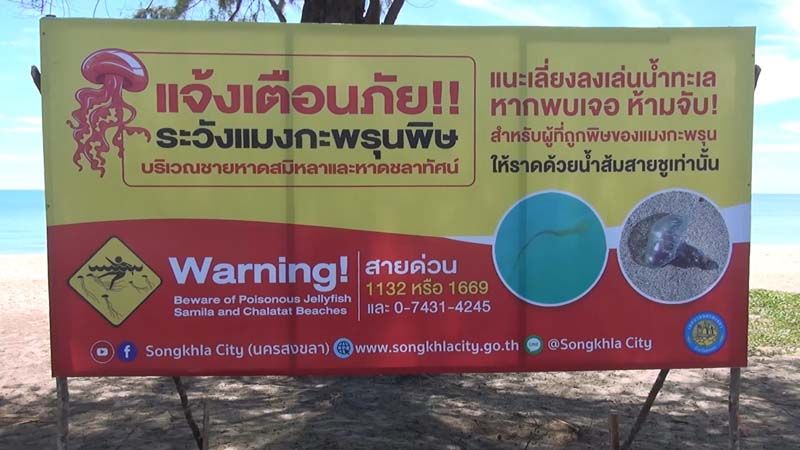ยังคงมีการแจ้งเตือน เรื่องแมงกะพรุนพิษบริเวณชายหาดชลาทัศน์และชายหาดสมิหลาอย่างต่อเนื่อง แม้ว่าในช่วงนี้ ชายฝั่งจังหวัดสงขลา ทะเลเรียบ ไม่มีคลื่นลม ทางหน่วยงานที่เกี่ยวข้อง ปักธงสีเหลืองตลอดแนวชายหาดชลาทัศน์และชายหาดสมิหลาพร้อมมีข้อความแจ้งเตือนให้ระวังแมงกะพรุนพิษ ทั้งภาษาอังกฤษและภาษาไทยไว้อย่างชัดเจน