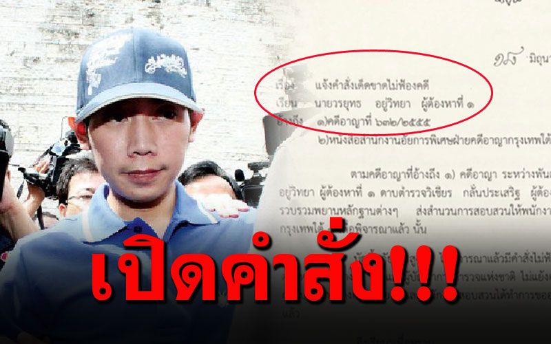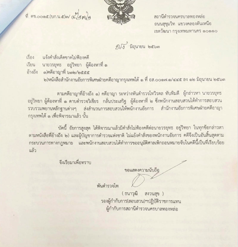 “บัดนี้ อัยการสูงสุด ได้พิจารณาแล้วมีคำสั่งไม่ฟ้องคดีต่อนายวรยุทธ อยู่วิทยา ในทุกข้อกล่าวหา ตามหนังสือที่อ้างถึงและผู้บัญชาการตำรวจแห่งชาติ ไม่แย้งคำสั่งของพนักงานอัยการ คดีนี้จึงเป็นอันสิ้นสุดตามกระบวนการทางกฏหมาย และพนักงานสอบสวนได้ทำการขออนุมัติศาลเพิกถอนหมายจับในคดีนี้เป็นที่เรียบร้อยแล้ว”