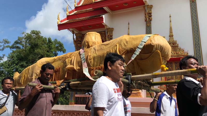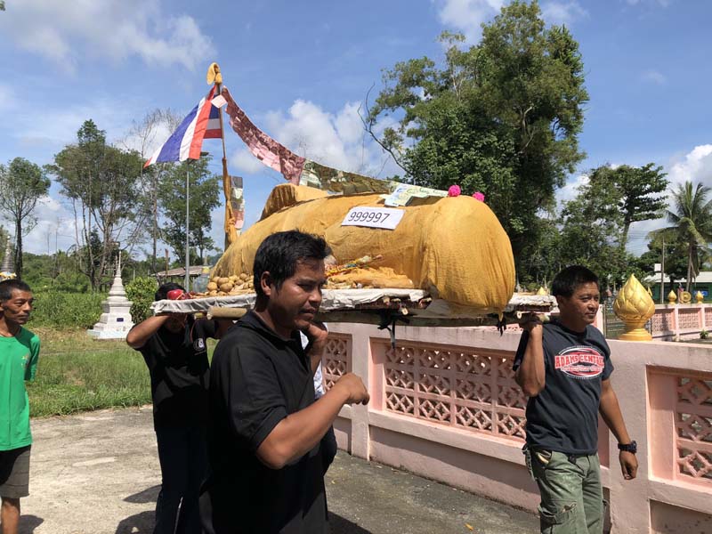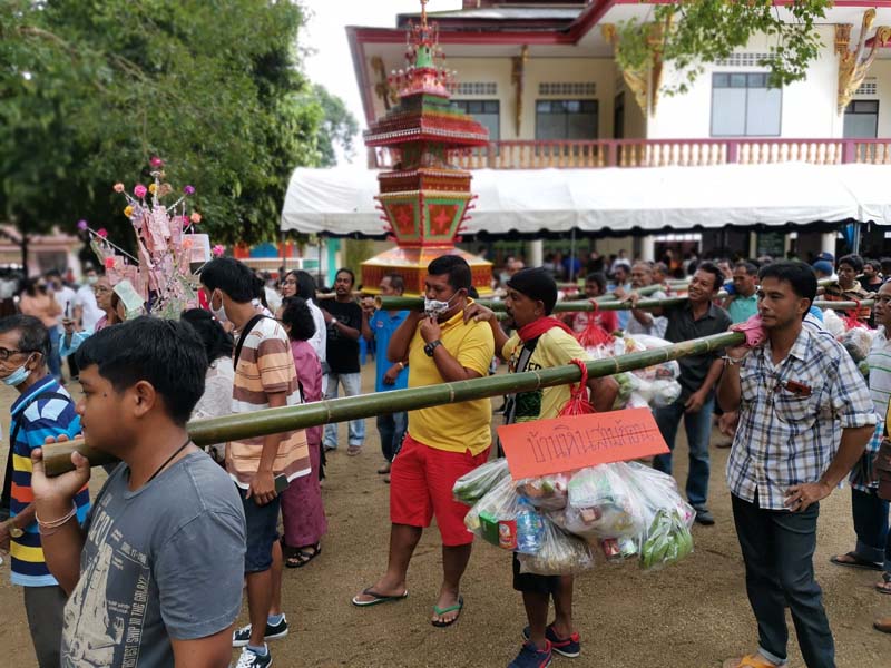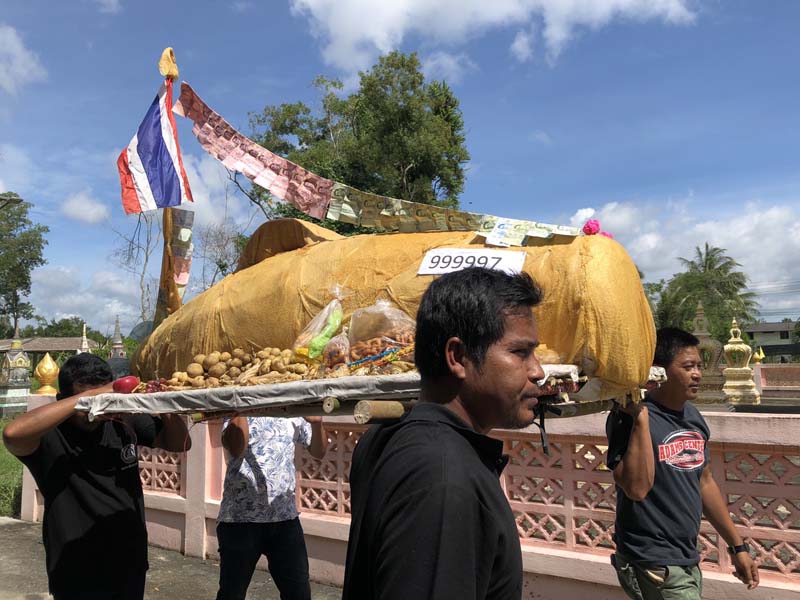 โดยหนึ่งในนั้นได้เขียนรางวัลที่1 หมายเลข 999997 ซึ่งเป็นงวดวันที่ 1 กันยายน ซึ่งเป็นงวดประวัติศาสตร์เอาไว้ด้วย แห่จากในหมู่บ้านมายังวัดเพื่อสร้างสีสันงานบุญเดือนสิบในปีนี้ จากปกติที่จะสร้างหมฺรับ เป็นเจดีย์หรือเรื่องราวที่เกี่ยวกับวันสารทเดือนสิบ เพื่อสร้างสีสันและบันทึกประวัติศาสตร์เหตุการณ์ทางการเมืองว่าปีนี้มีเรื่องราวอะไรเกิดขึ้นกับบ้านเมืองบ้างซึ่งเป็นกุศโลบายอีกอย่างหนึ่งของชาวบ้าน