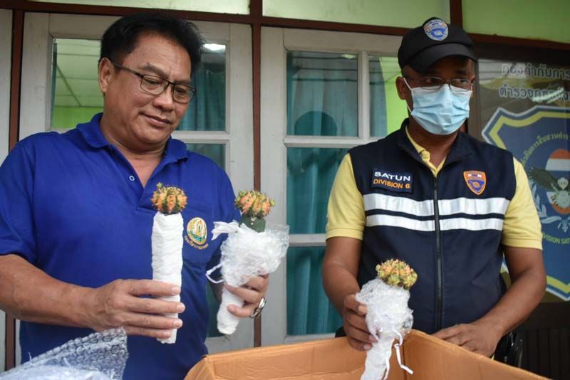 เมื่อไปถึงพบเป็นอาคารโรงเรือนตรวจสอบภายในพบลังไม้จำนวนมากข้างในมีไก่พันธุ์ไก่ชนรวมทั้งสิ้น 200 ตัว มีเต่าดาวอินเดีย พร้อมเต่าซูกาต์ จำนวน60ตัว มีอาหารคนและยาไก่ บอนสีและตะบองเพชร จำนวนหนึ่ง เจ้าหน้าที่จึงได้ตรวจยึดเป็นของกลางนำไปลงบันทึกประจำวันที่สภ.เมืองสตูล