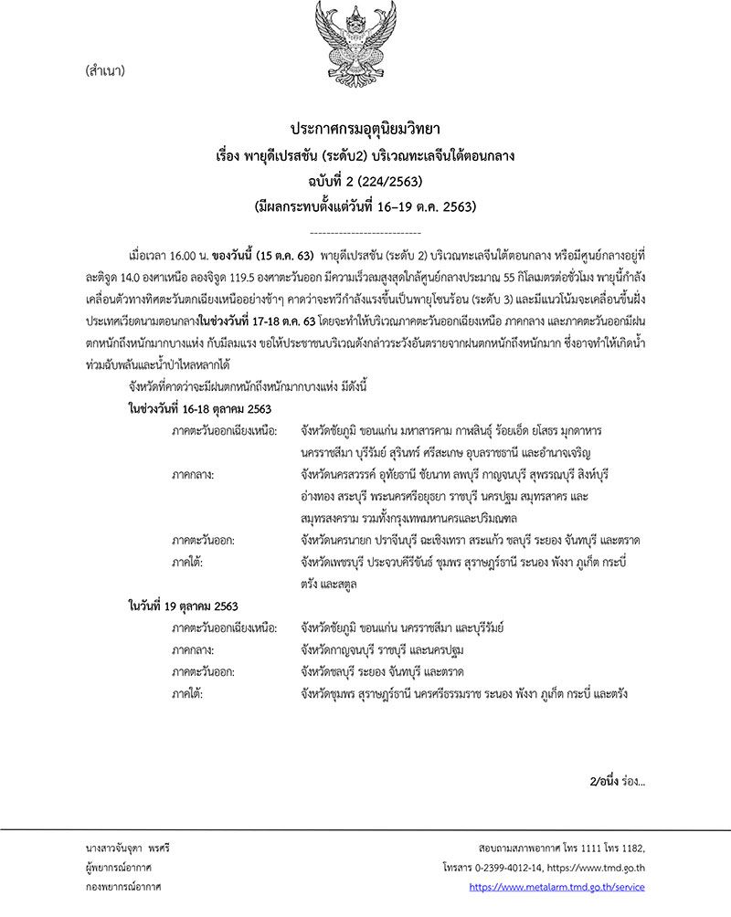 วันที่ 15 ตุลาคม 2563 เวลา 16.00 น. พายุดีเปรสชัน (ระดับ 2) บริเวณทะเลจีนใต้ตอนกลาง หรือมีศูนย์กลางอยู่ที่ละติจูด 14.0 องศาเหนือ ลองจิจูด 119.5 องศาตะวันออก มีความเร็วลมสูงสุดใกล้ศูนย์กลางประมาณ 55 กิโลเมตรต่อชั่วโมง พายุนี้กำลังเคลื่อนตัวทางทิศตะวันตกเฉียงเหนืออย่างช้าๆ คาดว่าจะทวีกำลังแรงขึ้นเป็นพายุโซนร้อน (ระดับ 3) และมีแนวโน้มจะเคลื่อนขึ้นฝั่งประเทศเวียดนามตอนกลางในช่วงวันที่ 17-18 ต.ค. 63 โดยจะทำให้บริเวณภาคตะวันออกเฉียงเหนือ ภาคกลาง และภาคตะวันออกมีฝนตกหนักถึงหนักมากบางแห่ง กับมีลมแรง ขอให้ประชาชนบริเวณดังกล่าวระวังอันตรายจากฝนตกหนักถึงหนักมาก ซึ่งอาจทำให้เกิดน้ำท่วมฉับพลันและน้ำป่าไหลหลากได้