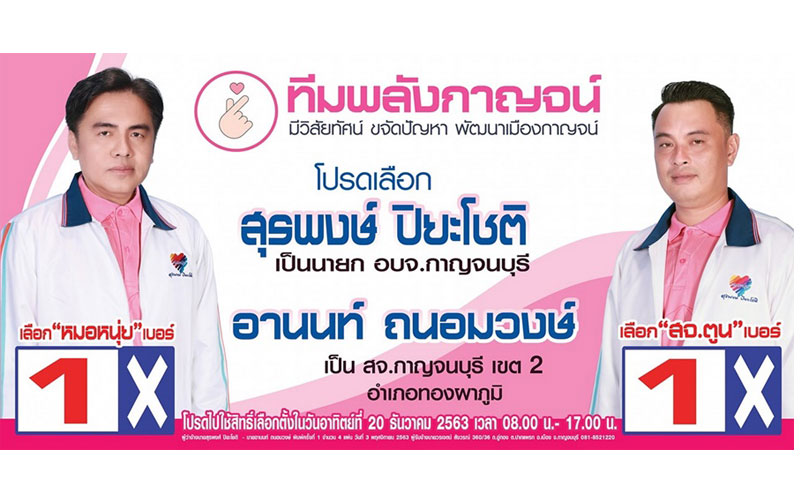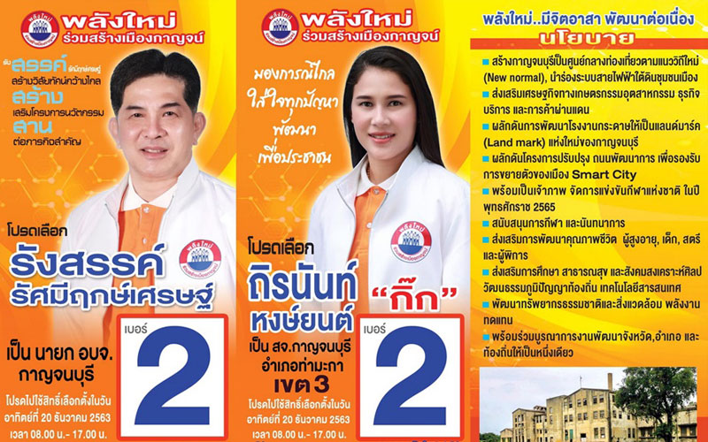 เจาะวิสัยทัศน์ 2 ผู้สมัคร ส.อบจ.กาญจนบุรี "น้องกิ๊ก" ผู้สมัคร ส.อบจ.หน้าใหม่แห่ง "ทีมพลังใหม่" มาพร้อมสโลแกน #พลังใหม่ "มองการไกล ใส่ใจทุกปัญหา พัฒนา เพื่อประชาชน" อีกราย "สจ.ตูน" อดีต ส.อบจ.ทองผาภูมิ 2 สมัยแห่ง "พลังกาญจน์" ดีกรี ป.โท รัฐประศาสนศาสตร์ ม.บ้านสมเด็จเจ้าพระยา ทองผาภูมิต้องดีกว่าเดิม