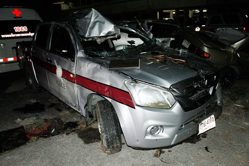 ที่เกิดเหตุพบเจ้าหน้าที่ตำรวจได้ทำการตรวจยึดรถแบ๊คโฮยี่ห้อซูมิโตโม่สีเหลืองขนาดใหญ่ไว้ได้ 1 คัน จึงนำมาจอดไว้จุดที่พ้นกีดขวางการจราจร โดยที่ห้องคนขับมีร่องรอยการถูกยิงจนกระจกเป็นรูโหว่ น้ำมันไฮดรอลิครั่วไหลนองพื้น ข้างกันยังพบรถจยย.ยี่ห้อฮอนด้ารุ่นเวฟสีดำทะเบียน 2ขฒ-7214 กทม.ได้รับความเสียหายจอดอยู่1คัน ห่างกันประมาณ 300 เมตร มีร่องรอบรถยนต์ตกลงไปในคลองก่อนจะนำขึ้นไปแล้วเพื่อนำไปเก็บไว้ที่ สภ.หนองเสือ พบว่าเป็นรถยนต์กระบะของเจ้าหน้าที่ตำรวจสภ.หนองเสือ ยี่ห้ออีซูซุสีบรอนด์แบบ4ประตู ทะเบียน 7กอ-4080 กทม.ซึ่งได้รับความเสียหายทั้งคันเนื่องจากถูกกระบวยรถแบคโฮเหวี่ยงใส่จนตกคลองได้รับความเสียหาย