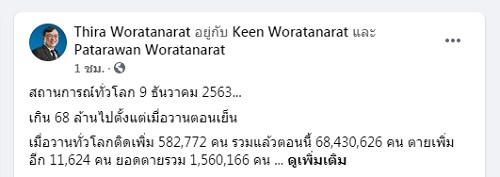 9 ธันวาคม 2563 รศ.นพ.ธีระ วรธนารัตน์ คณะแพทยศาสตร์ จุฬาลงกรณ์มหาวิทยาลัย โพสต์ข้อความลงบนเฟซบุ๊กส่วนตัว “Thira Woratanarat” เกี่ยวกับสถานการณ์โควิด-19 มีเนื้อหาดังนี้...