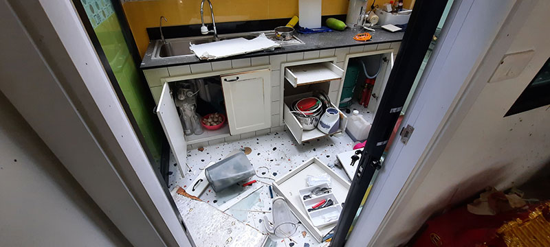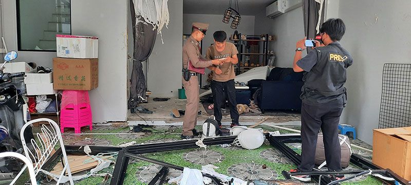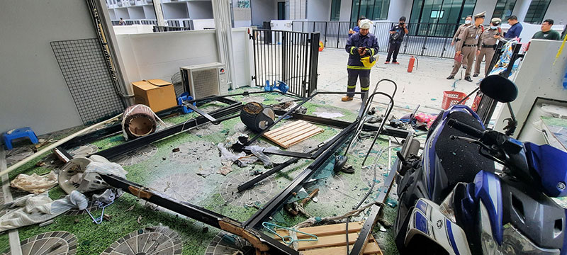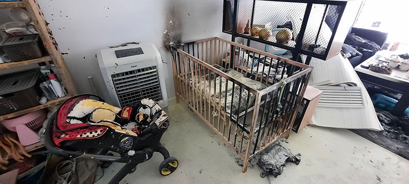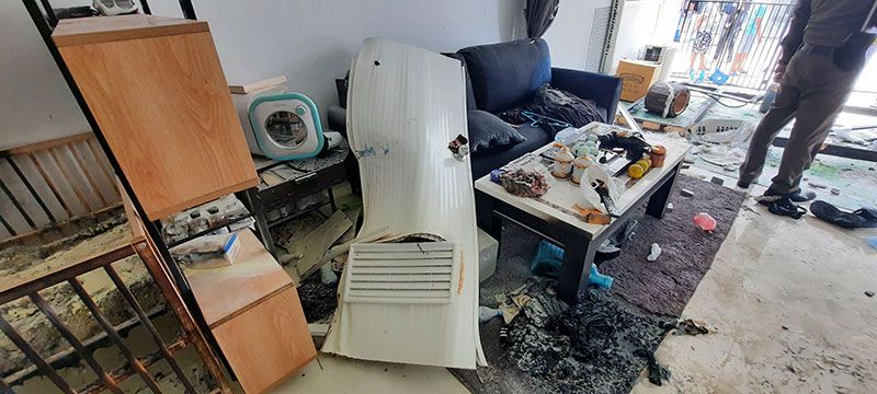 ที่เกิดเหตุเป็นทาวโฮมขนาด 2 ชั้นเลขที่ 989/239 แยกซอยที่ 5 หมู่ที 2 ต.บ้านคลองสวน อ.พระสมุทรเจดียื จ.สมุทรปราการ บริเวณชั้นล่างพบสภาพพังยับเยินข้าวของกรกะเด็นกระจายเกลื่อน ประตูกระจก ฝาพนังแบบกระจกพังถล่ม เศษกระจกกระจายเกลื่อนพื้นจนข้ามไปอีกฝั่งของถนน ภายในบ้านพบข้าวของเครื่องใช้ถูกไฟไหม้เสียหาย ภายในห้องครัวหลังคาบ้านพังถล่มลงมา เตียงนอนเด็กและรถเข็นเด็กเล็กถูกไฟไหม้เสียหาย