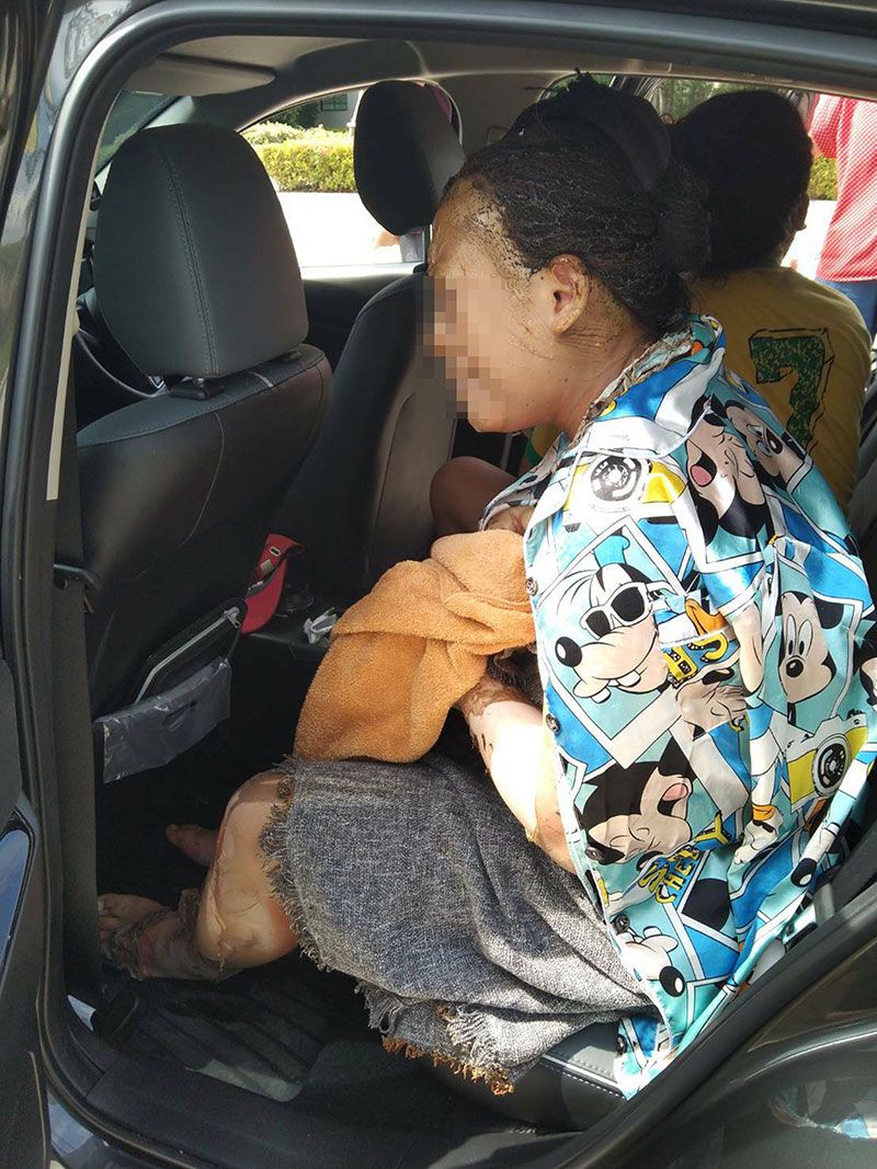 จากการสอบถาม นายสะได หาร อายุ 34 ปี ชาวกัมพูชา ซึ่งเป็นช่างทาสีอยู่ข้างบ้านที่เกิกดเหตุ เล่าว่า ก่อนเกิดเหตุช่วงเวลาประมาณ 08.00 น. ตนพร้อมเพื่อนคนงานอีก 3 คน มารับเหมาตกแต่งบ้านและทาสีบ้านซึ่งอยู่ติดกับบ้านที่เกิดเหตุ ในระหว่างที่ตนกำลังเดินมาหยิบสีหน้าบ้านได้ยินเสียงระเบิดออกมาจากบ้านที่เกิดเหตุดังสนั่น ก่อนที่จะเห็นลูกไฟขนาดใหญ่พุ่งออกมาจากตัวบ้านตนตกใจจึงนั่งแอบข้างกำแพง ก่อนที่จะเห็นเจ้าของบ้านซึ่งเป็นผู้หญิงอุ้มลูกน้อยวิ่งออกมาในสภาพเนื้อตัวทั้งคู่ถูกไฟคลอกจนผิวหนังหลุดลุ่ย ตนจึงรีบหาผ้าชุบน้ำมาห่อตัวทั้ง 2 คน ก่อนที่จะวิ่งไปเรียกยามหน้าหมู่บ้านให้รีบแจ้งเจ้าหน้าที่ตำรวจและรถดับเพลิง พร้อมรถพยาบาลให้มาช่วยเหลืออย่างเร่งด่วน