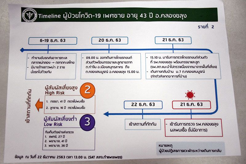 รายที่ 2 เพศชาย อายุ 43 ปี ภูมิลำเนาอยู่ที่ อ.คลองขลุง จ.กำแพงเพชร มีอาชีพขับรถส่งอาหารทะเลตลาดแม่กลอง -ตลาดทะเลไทย เข้ารับการตรวจที่โรงพยาบาลคลองขลุง ผลพบเชื้อแต่ไม่แสดงอาการ มีผู้สัมผัสเสี่ยงสูง 2 ราย ตรวจไม่พบเชื้อทั้ง 2 ราย และผู้สัมผัสเสี่ยงต่ำ จำนวน 3 ราย ขณะนี้ผู้ป่วยทั้ง 2 รายเข้ารับการรักษาที่โรงพยาบาลแล้ว และ ผู้สัมผัสเสี่ยงสูงและเสี่ยงต่ำได้เข้าสถานที่กักกันทั้งหมด