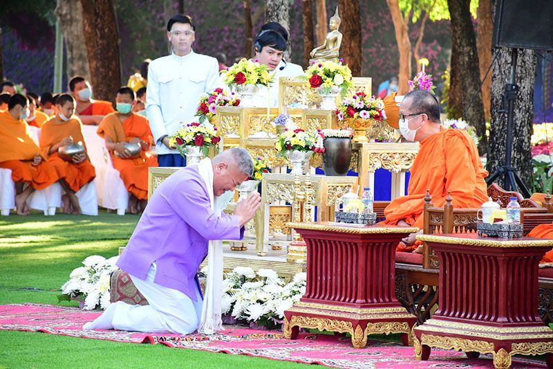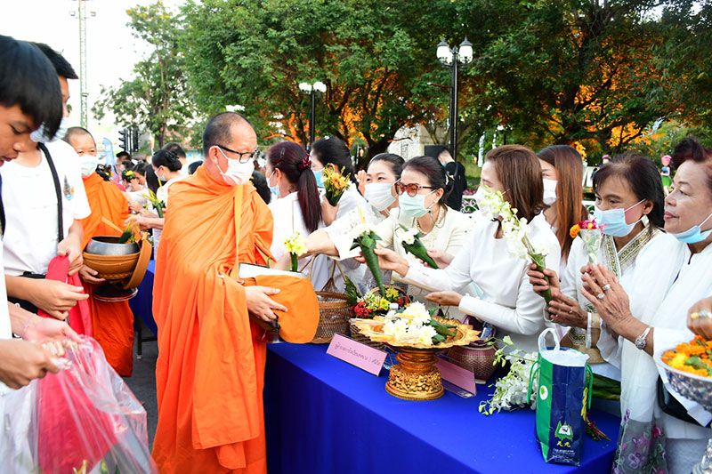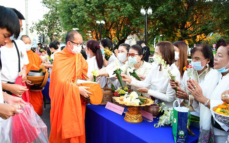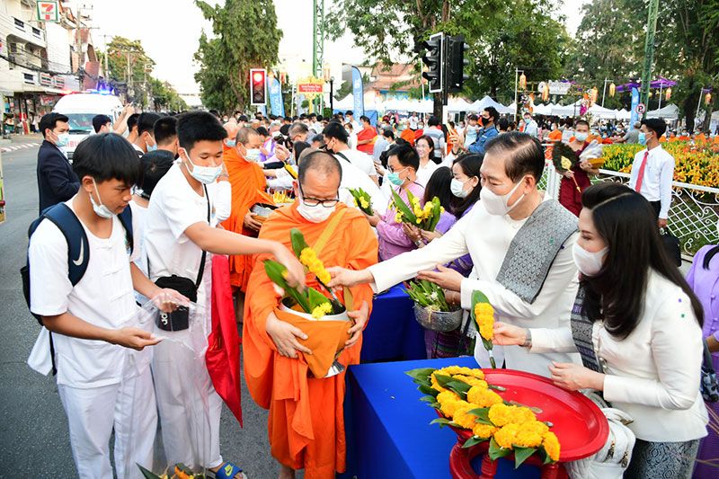 จากนั้นพระสงฆ์และสามเณรออกรับบิณฑบาตรโดยพร้อมเพียงกัน และก่อนที่พระสงฆ์จะออกรับบิณฑบาตรดอกไม้โดยมีประชาชนออกมาทำบุญกันอย่างคับคั่ง สร้างความปลื้มปิติและประทับใจแก่นักท่องเที่ยวที่ไปเยือน จ.เชียงราย ในช่วงนี้เป็นอย่างยิ่ง