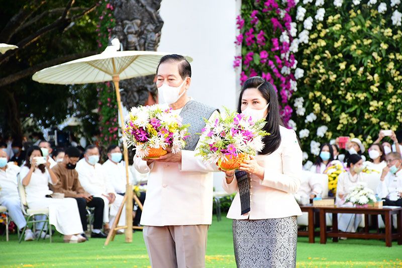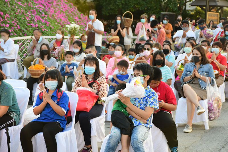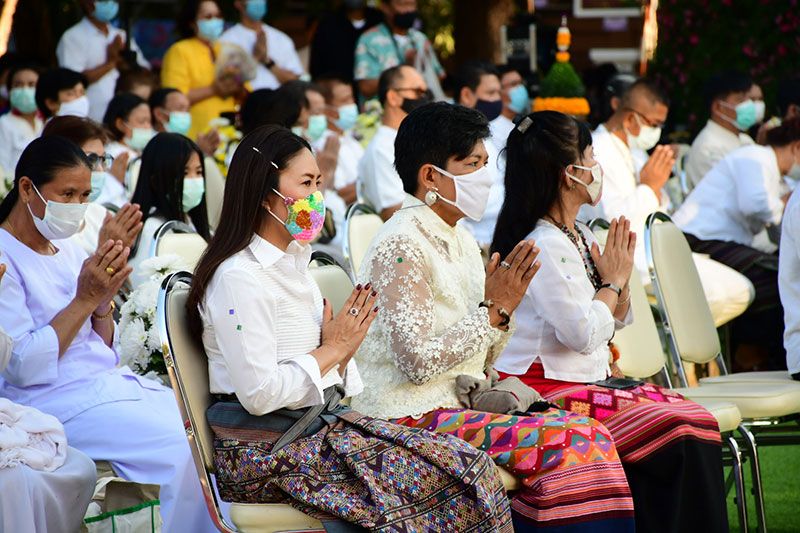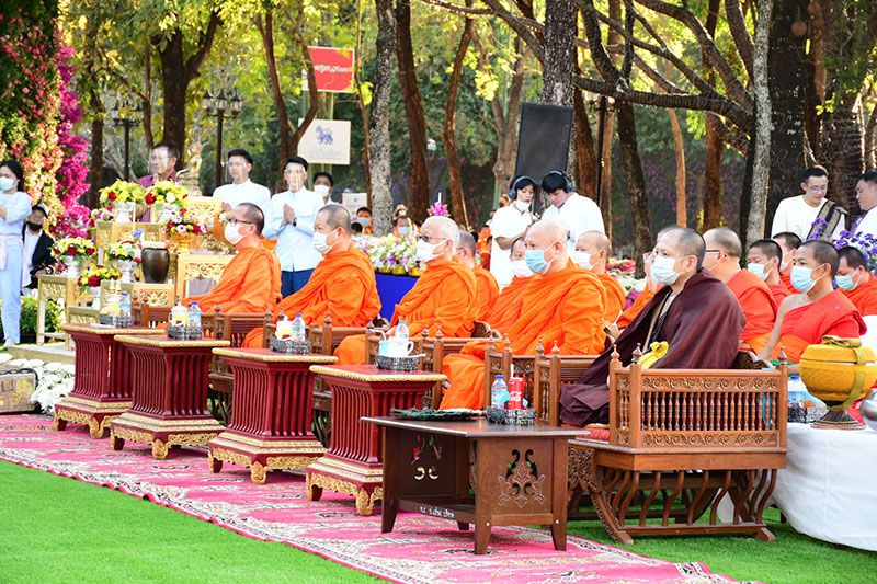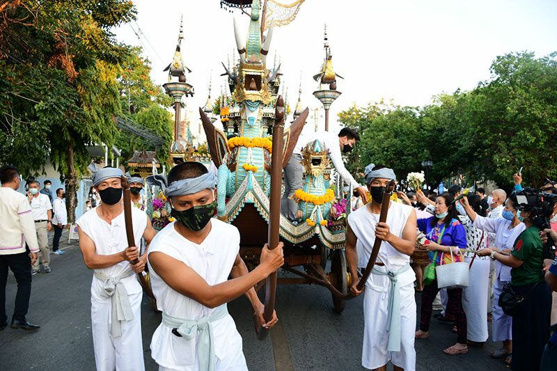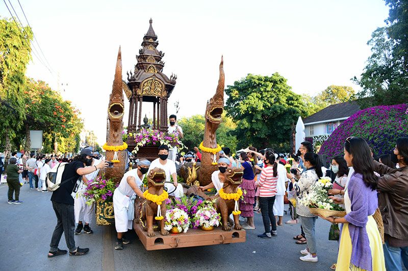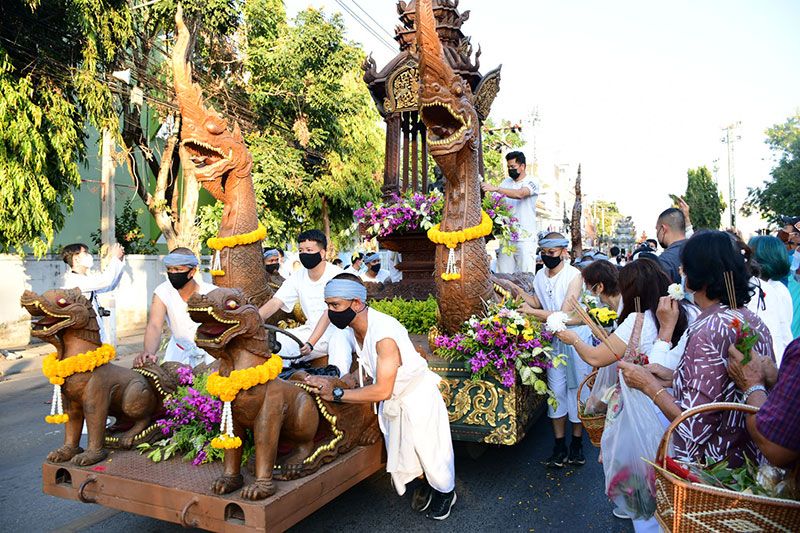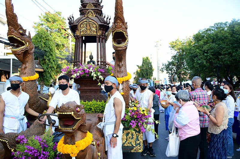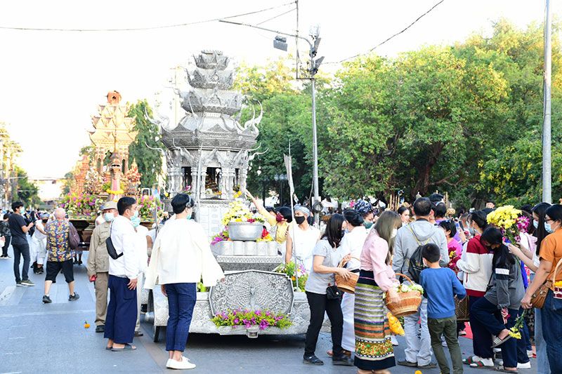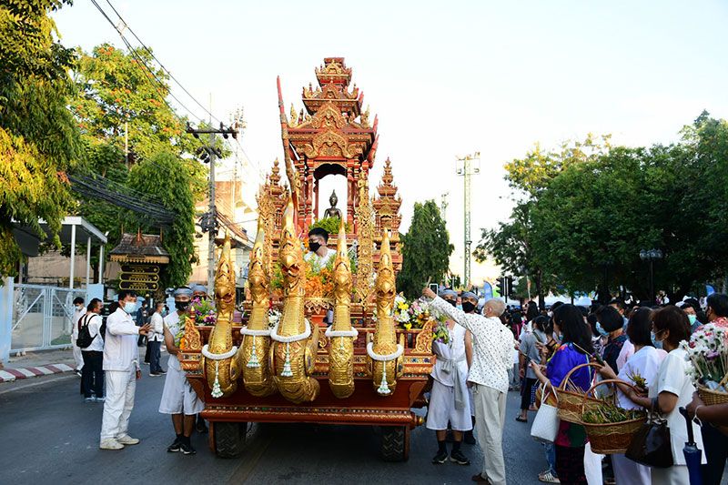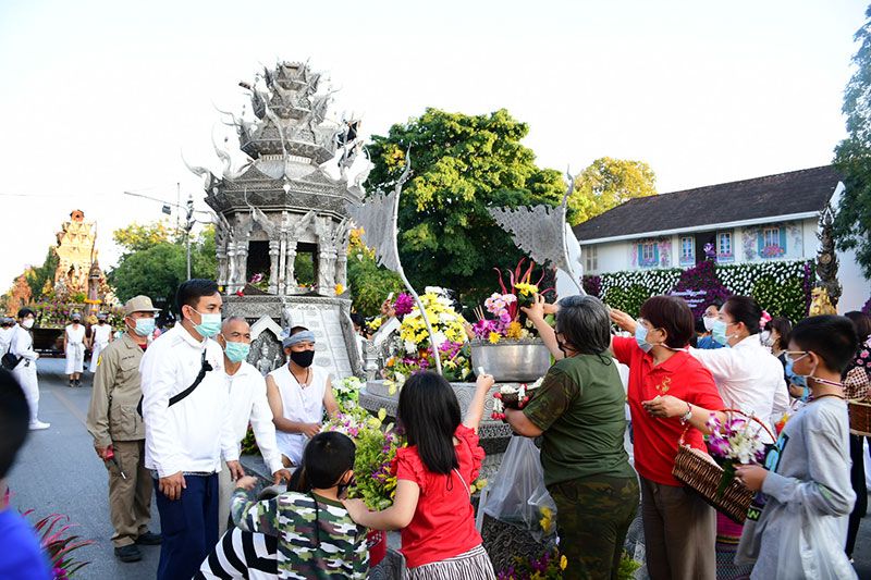ในครั้งนี้ทางพระรัตนมุนี เจ้าคณะ จ.เชียงราย ได้นำคณะสงฆ์และสามเณรจำนวน 69 รูป ประกอบพิธีสวดเพื่อขับไล่ไวรัสโควิด-19 ด้วย ก่อนที่รถบุษบกที่งดงามจะเคลื่อนไปตามถนนและนักท่องเที่ยวต่างนำดอกไม้ถวาย ซึ่งสร้างโดยศิลปินและนายช่างที่สะท้อนเอกลักษณ์ทางศิลปะของ 8 จังหวัดภาคเหนือตอนบน