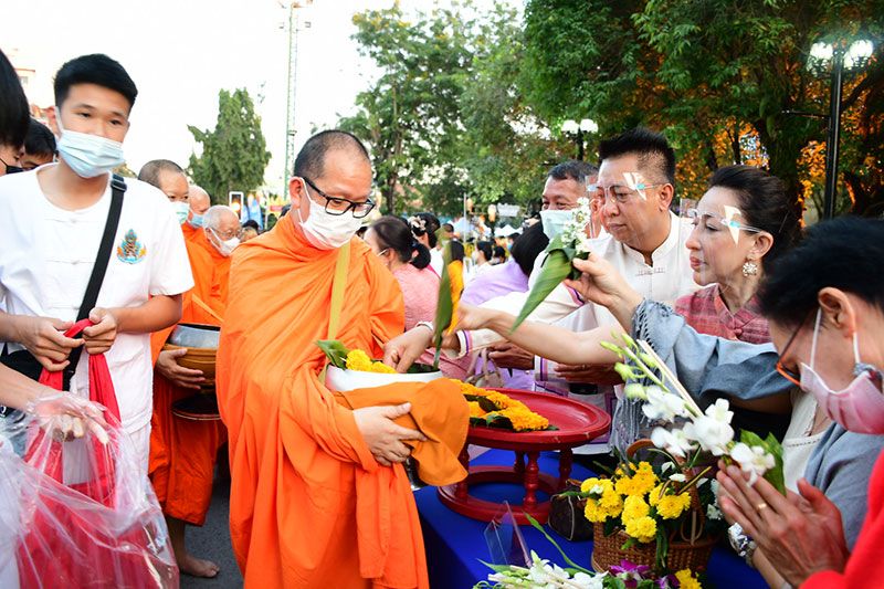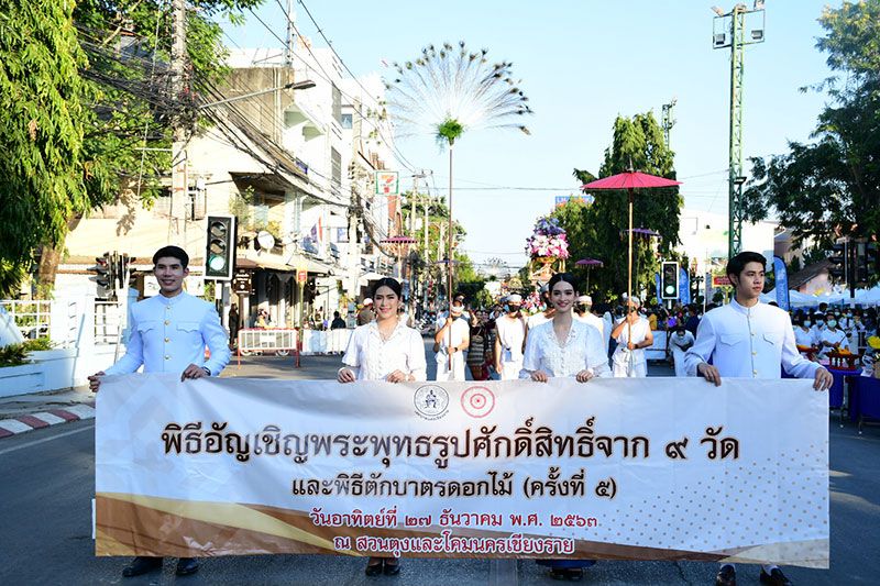 โดยมีการอัญเชิญพระพุทธรูปศักดิ์สิทธิ์ 9 องค์จาก 9 วัดใน อ.เมืองเชียงราย ประดิษฐานบนรถบุษบก 9 คัน เคลื่อนไปตามถนนธนาลัยเพื่อให้นักท่องเที่ยวได้ร่วมกันนมัสการและร่วมตักบาตรดอกไม้แด่พระสงฆ์