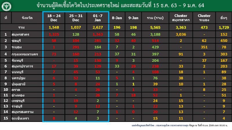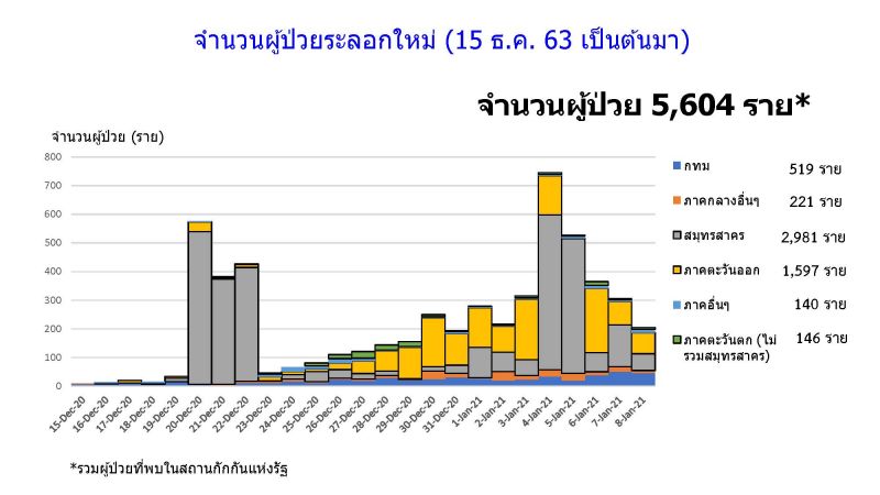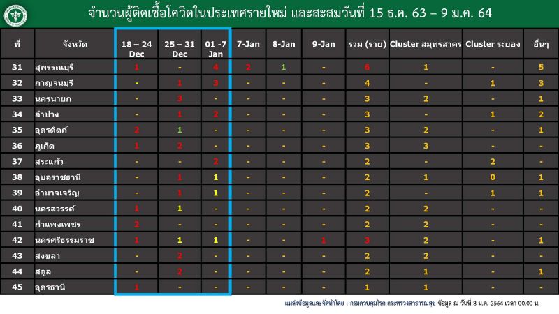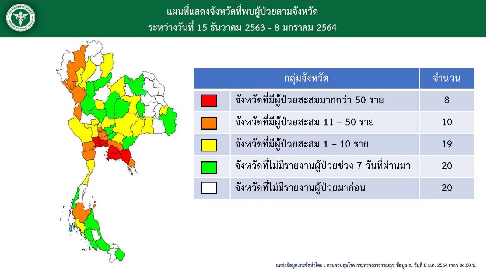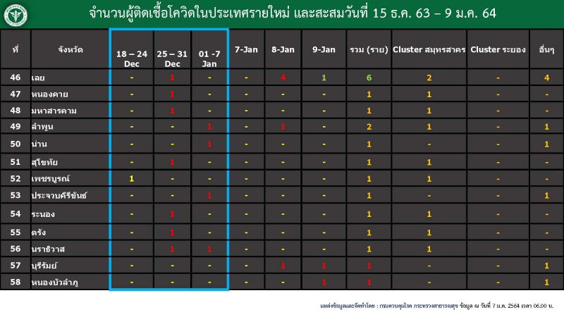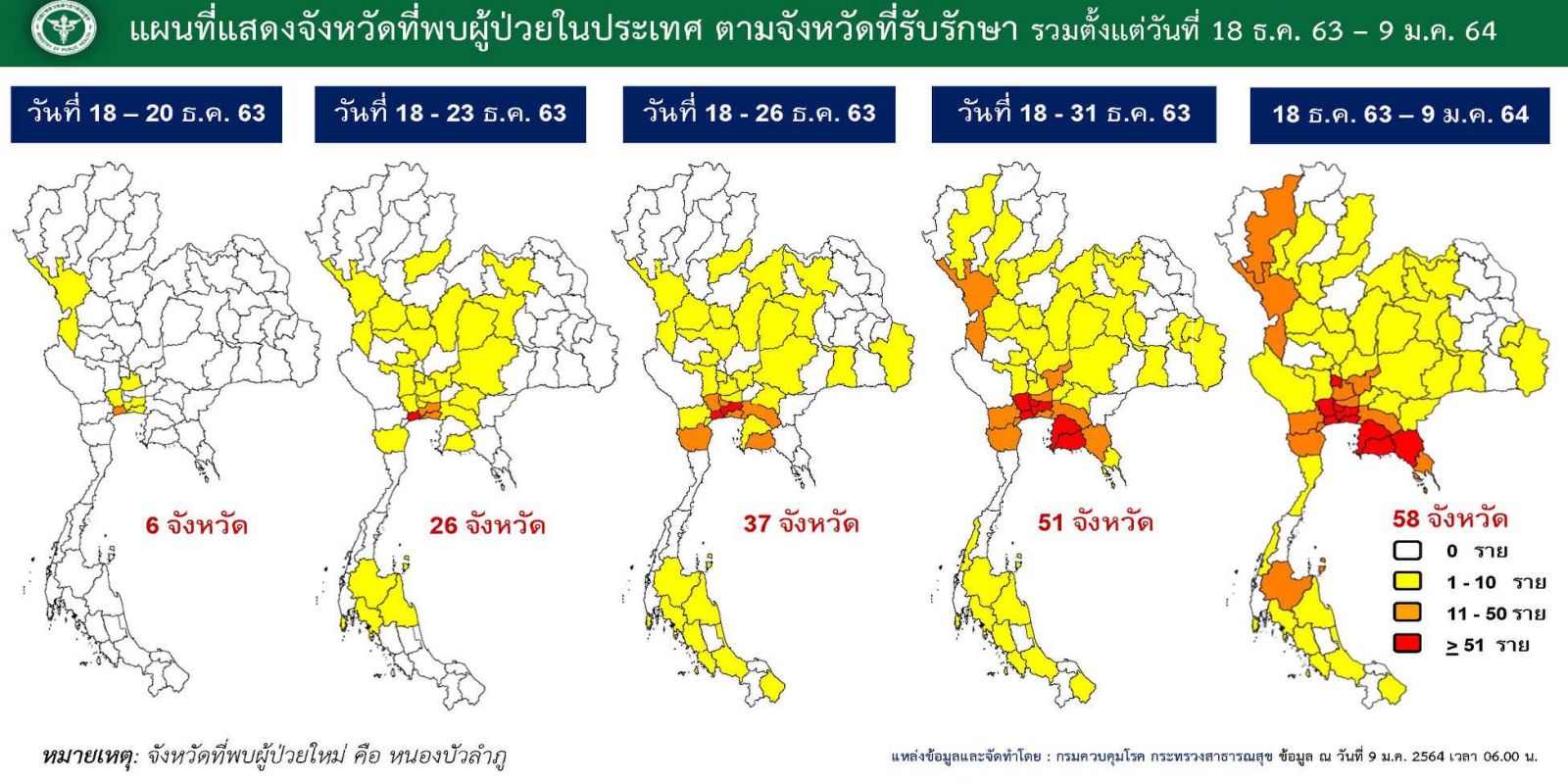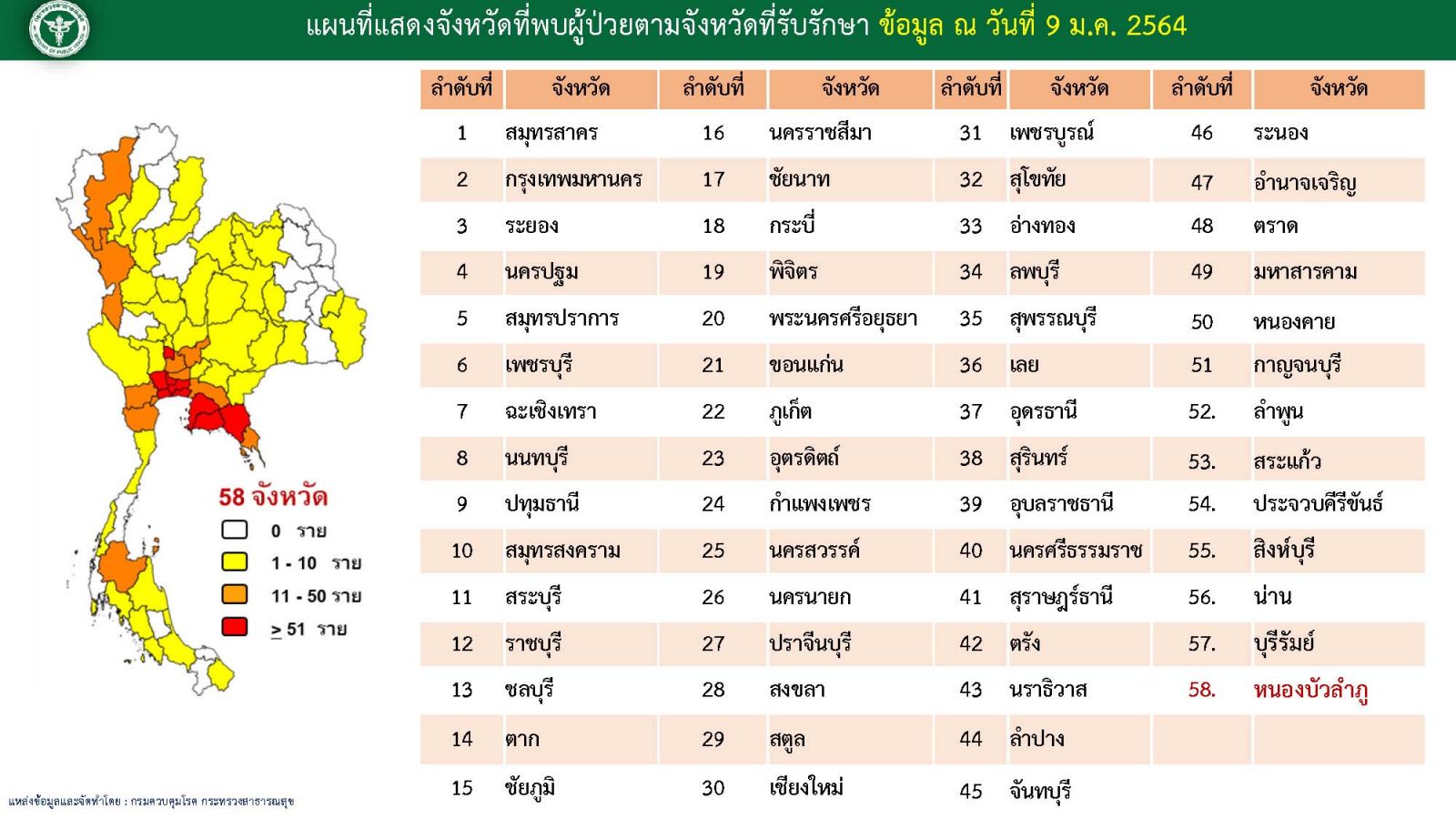 9 มกราคม 2564 นพ.ทวีศิลป์ วิษณุโยธิน โฆษกศบค. แถลงสถานการณ์การติดเชื้อ COVID-19 พบผู้ป่วยรายใหม่ 212 ราย ผู้ป่วยยืนยันสะสม 10,053 ราย รักษาหาย 291 ราย รวมหายป่วยแล้ว 5,546 ราย ยังรักษาอยู่ในโรงพยาบาล 4,440 ราย เสียชีวิตสะสม 67 ราย โดยขณะนี้ติดเชื้อแล้ว 58 จังหวัด ซึ่งจังหวัดที่พบการติดเชื้อล่าสุดคือ จ.หนองบัวลำภู พบผู้ป่วยติดเชื้อโควิด-19 จำนวน 1 ราย