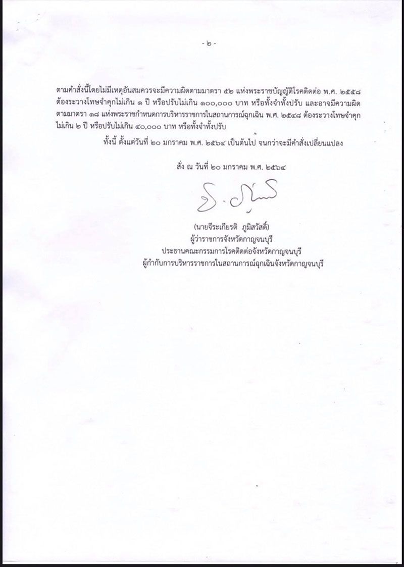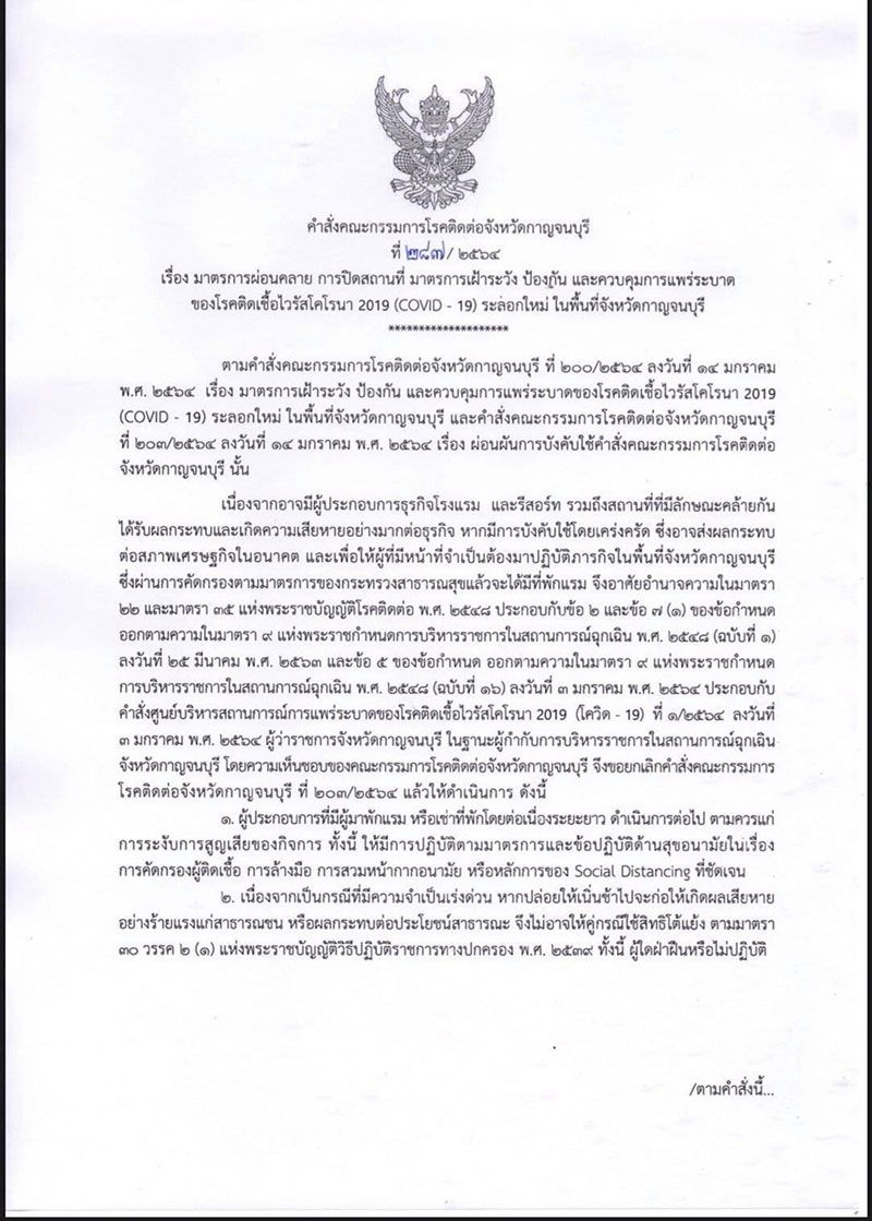 ผู้ว่าราชการจังหวัดกาญจนบุรี ในฐานะผู้กำกับการบริหารราชการในสถานการณ์ฉุกเฉินจังหวัดกาญจนบุรี โดยความเห็นชอบของคณะกรรมการโรคติดต่อจังหวัดกาญจนบุรี จึงขอยกเลิกคำสั่งคณะกรรมการโรคติดต่อจังหวัดกาญจนบุรี ที่ 203/2564 แล้วให้ดำเนินการ ดังนี้ ผู้ประกอบการที่มีผู้มาพักแรม หรือเช่าที่พักโดยต่อเนื่องระยะยาว ดำเนินการต่อไป ตามควรแก่การระงับการสูญเสียของกิจการ ทั้งนี้ ให้มีการปฏิบัติตามมาตรการและข้อปฏิบัติด้านสุขอนามัยในเรื่อง การคัดกรองผู้ติดเชื้อ การล้างมือ การสวมหน้ากากอนามัย หรือหลักการของ Social Distancing ที่ชัดเจน