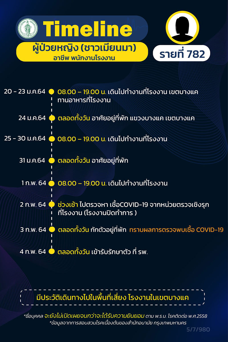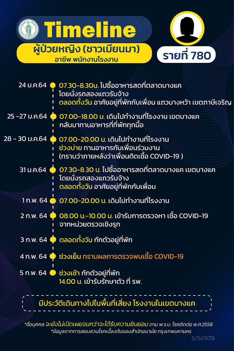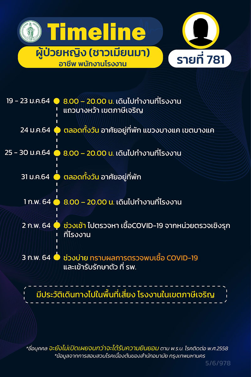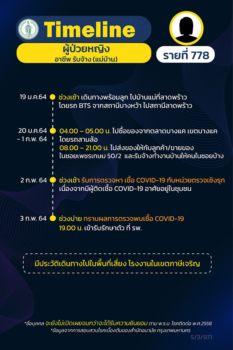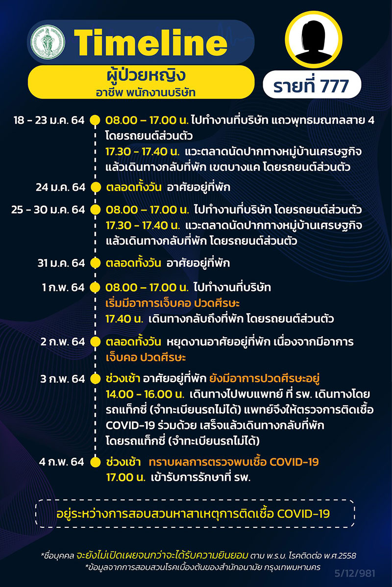 Timeline แถลงไปแล้ว 776 ราย และวันนี้ มี Timeline ผู้ติดเชื้อที่อยู่ใน กทม.ซึ่งได้สอบสวนโรคเสร็จเรียบร้อยแล้ว เพิ่มอีก 6 รายTime line 6 ราย มีรายละเอียดตามรูปด้านล่าง