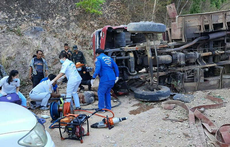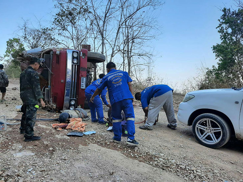 บริเวณทางเขายอดเขาหลวง ซึ่งเป็นพื้นที่ลาดชัน หมู่ที่ 3 ต.อ่างทอง อ.เมือง จ.ราชบุรี พบเจ้าหน้าที่มูลนิธิปฐมบรมราชานุสรณ์ กำลังช่วยกันนำร่างผู้บาดเจ็บที่ติดอยู่ในรถยนต์ดัดเพลิงทะเบียน บว- 8994 ราชบุรี ในลักษณะพลิกตะแคงอยู่ในสภาพพังเสียหายยับเยิน ได้กลิ่นน้ำมันลอยออกมาจากตัวรถ ด้านหลังคามีร่องรอยพังยุบครูดกับผิวถนนเสียหายทั้งคัน