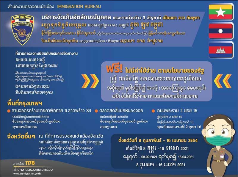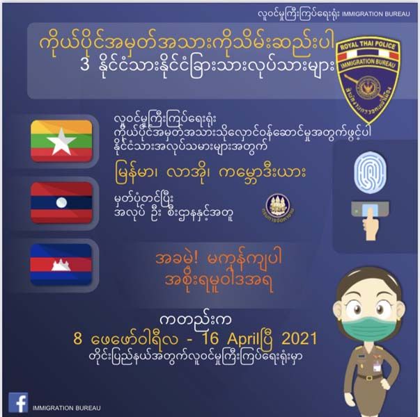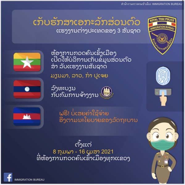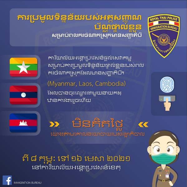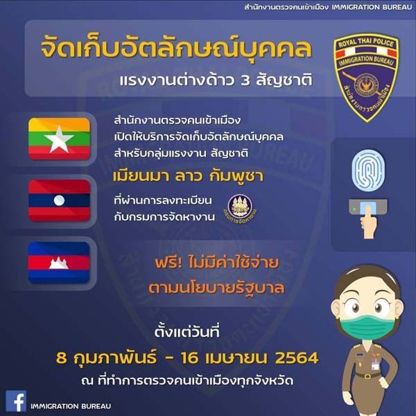 9 มีนาคม 2564 คณะทำงานโฆษกสำนักงานตรวจคนเข้าเมือง (สตม.) นำโดย พล.ต.ต.อาชยน ไกรทอง รอง ผบช.สตม. ในฐานะโฆษก สตม. , พ.ต.อ.ภัคพงศ์ สายอุบล รอง ผบก.ตม.1/รองโฆษก สตม. , พ.ต.อ.เชิงรณ ริมผดี รอง ผบก.ตม.2/รองโฆษก สตม. , พ.ต.อ.หญิง เอกอาภา ตันศิริ รอง ผบก.อก.สตม./รองโฆษก สตม. , พ.ต.อ.หญิง ทิพวรรณ โยมา ผกก.ฝอ.5 บก.อก.สตม./เลขานุการกองงานโฆษก สตม. และ พ.ต.ต.หญิง พัชรี ศรีเผือก สว.กก.2 บก.ตม.1/ผู้ช่วยเลขานุการกองงานโฆษก สตม. ร่วมกันเปิดเผยว่า สำนักงานตรวจคนเข้าเมือง โดย พล.ต.ท.สมพงษ์ ชิงดวง ผบช.สตม. แจ้งประชาสัมพันธ์การจัดเก็บอัตลักษณ์แรงาน 3 สัญชาติ ได้แก่ เมียนมา ลาว และกัมพูชา ที่ผ่านการลงทะเบียนกับกรมการจัดหางานเรียบร้อยแล้ว ให้ไปดำเนินการจัดเก็บอัตลักษณ์บุคคลของคนต่างด้าวได้ตั้งแต่วันที่ 8 กุมภาพันธ์-16 เมษายน 2564 ณ ที่ทำการตรวจคนเข้าเมือทุกจังหวัดทั่วประเทศฟรี โดยไม่เสียค่าใช้จ่าย ซึ่งเป็นไปตามนโยบายของรัฐบาล