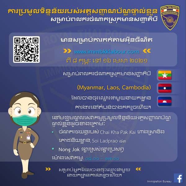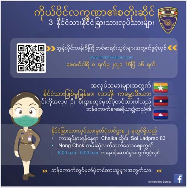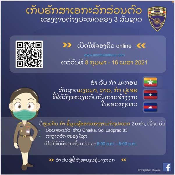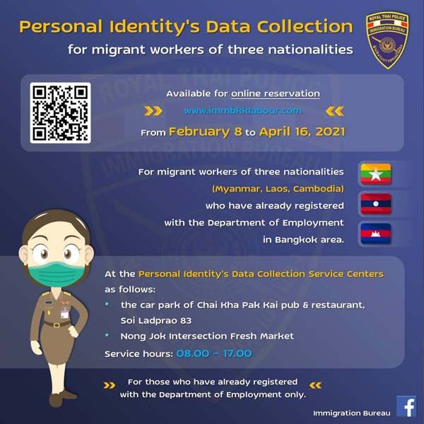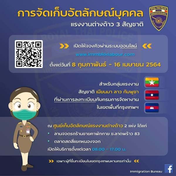 สำหรับกลุ่มแรงงานต่างด้าว 3 สัญชาติ ในเขตพื้นที่กรุงเทพมหานคร ที่ผ่านการลงทะเบียนกับกรมการจัดหางานเรียบร้อยแล้ว ให้ดำเนินการจองคิวผ่านระบบออนไลน์ได้ที่ www.immbkklabour.com ก่อน แล้วจึงมาจัดเก็บอัตลักษณ์บุคคลของคนต่างด้าว เพื่อพิสูจน์ตัวตนของคนต่างด้าว ได้ตั้งแต่วันที่ 8 กุมภาพันธ์-16 เมษายน 2564 ระหว่างเวลา 08.00-17.00 น. โดยเปิดให้บริการทุกวัน ณ ศูนย์เก็บอัตลักษณ์แรงงานต่างด้าวในพื้นกรุงเทพมหานคร จำนวน 2 แห่ง ได้แก่ 1. ลานจอดรถร้านชายคาพักกาย ซอยลาดพร้าว 83 และ 2. ตลาดสดสี่แยกหนองจอก