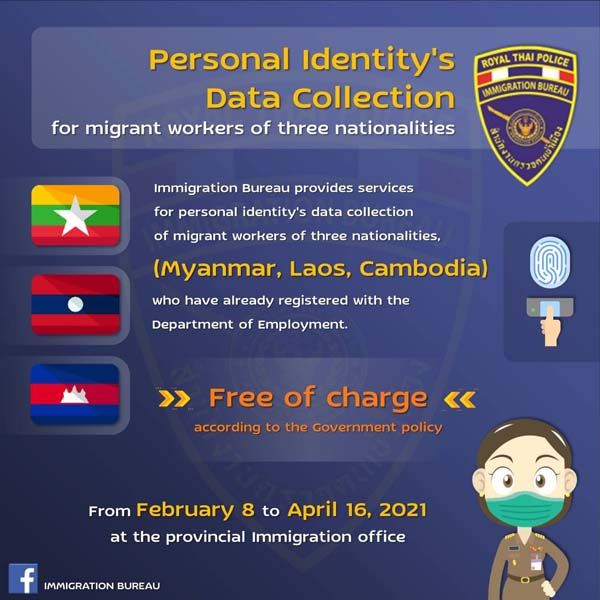 พล.ต.ต.อาชยน ไกรทอง รอง ผบช.สตม./โฆษก สตม. กล่าวเพิ่มเติมว่า การดำเนินการดังกล่าว พล.ต.ท.สมพงษ์ ชิงดวง ผบช.สตม. ได้กำชับการจัดเก็บข้อมูลอัตลักษณ์ของบุคคลแรงงาน 3 สัญชาติ ให้เจ้าหน้าที่ปฏิบัติหน้าที่เป็นไปตามระเบียบและกฎหมายที่เกี่ยวข้อง และเป็นการดำเนินการให้ฟรี ไม่มีการเสียค่าใช้จ่ายใด ๆ ซึ่งเป็นการปฏิบัติตามนโยบายของรัฐบาล และเน้นย้ำให้ปฏิบัติตามมาตรการป้องกันการติดเชื้อโควิด-19 อย่างเคร่งครัด เพื่อความปลอดภัยของเจ้าหน้าที่และผู้ที่มารับบริการ รวมถึงลดความเสี่ยงต่อการติดเชื้ออีกด้วย พร้อมทั้งขอความร่วมมือประชาสัมพันธ์ให้แรงงานต่างด้าว 3 สัญชาติ (เมียนมา ลาว กัมพูชา) ที่อยู่ในประเทศไทยให้ทราบทั่วถึงกัน ให้ไปดำเนินการจัดเก็บอัตลักษณ์บุคคลของคนต่างด้าว ได้แล้วตั้งแต่วันที่ 8 กุมภาพันธ์-วันที่ 16 เมษายน 2564 ณ ที่ทำการตรวจคนเข้าเมือทุกจังหวัด ในพื้นที่ที่ได้ผ่านการลงทะเบียนกับกรมจัดหางานไว้แล้ว