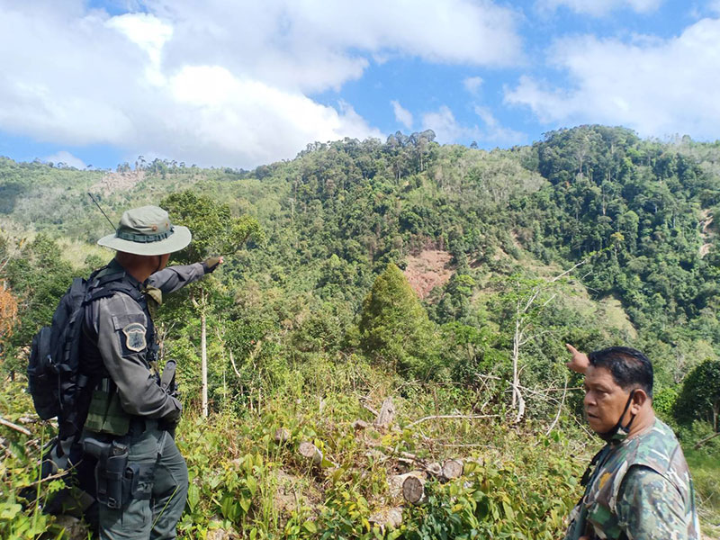 หลังได้รับรายงานคณะเจ้าหน้าที่เดินเท้าจากจุดจอดรถขึ้นไปบนภูเขาประมาณ 3 กม.ถึงเขตแนวชายแดนไทย-มาเลเซีย ระหว่างใกล้หลักเขตแดนที่ 47 ตรวจพบพื้นที่ป่าไม้สมบูรณ์กำลังถูกทำลายใหม่และเก่าจำนวนหลายแปลงมีการตัดโค่นต้นไม้มีค่าจำนวนมาก คณะเจ้าหน้าที่เดินเท้าตรวจพื้นที่ป่าไม้ถูกทำลายแล้วจำนวน 1 แปลง ที่บริเวณพิกัด 47 N QG 369745 ความสูงจากรระดับน้ำทะเลปานกลาง 834 เมตร