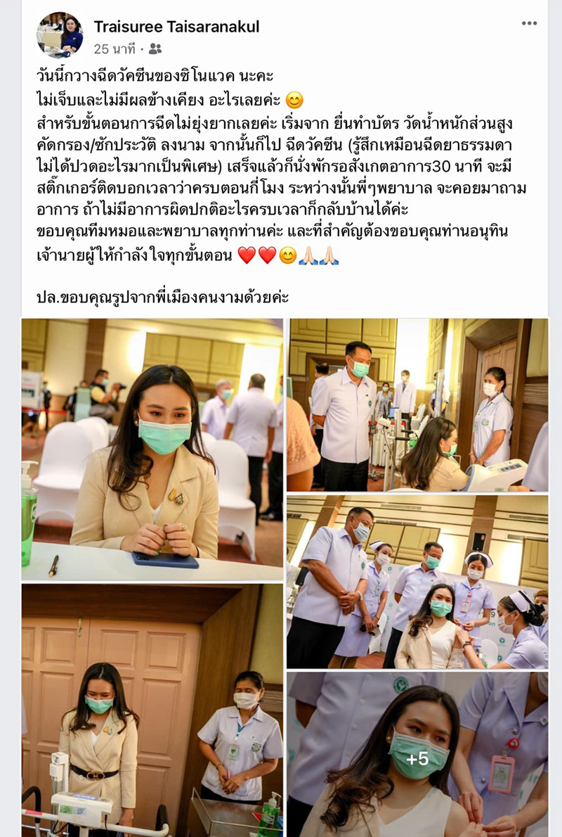 เมื่อเวลา 12.30 น.วันที่ 12 มีนาคม 2564 น.ส.ไตรศุลี ไตรสรณกุล รองโฆษกประจำสำนักนายกรัฐมนตรี ได้โพสต์ข้อความลงบนเฟซบุ๊กส่วนตัว "Traisuree Taisaranakul" ระบุว่า "วันนี้กวางฉีดวัคซีนของซิโนแวค นะคะ