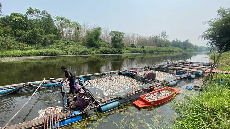 ซึ่งก่อนหน้านี้มีคนหาปลา มาบอกว่า ด้านบนมีปลาธรรมชาติตาย น้ำเปลี่ยนสีกำลังไหลลงมากระชัง ตนก็ไม่ได้เอะใจอะไร ได้แค่เปิดออกซิเจนเพิ่มให้ปลา แต่ก็ไม่ทัน ซึ่งกระชังแรก ที่อยู่ด้านเหนือนั้นเริ่มตายตอนเที่ยงคืน เช้ามาก็ตายทั้งหมดเลย ตั้งแต่เลี้ยงปลากระชังมาครั้งนี้ เป็นครั้งที่สามแล้วที่ปลาตายยกบ่อ แต่ที่สงสัยกันคาดว่าสาเหตุอาจจะมาจากการแอบปล่อยน้ำเสียจากโรงแป้ง ตนอยากจะร้องขอให้หน่วยงานที่รับผิดชอบ เข้าไปตรวจสอบขณะนี้เกษตกรผู้เลี้ยงปลาได้รับผลกระทบเป็นอย่างมาก