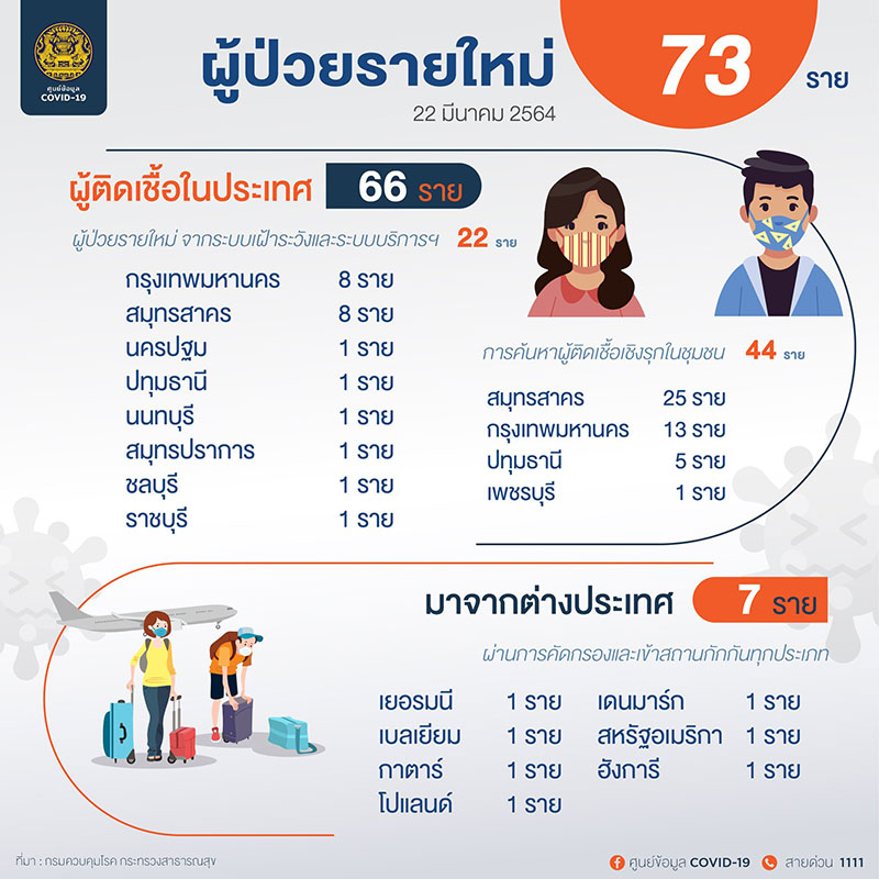 เมื่อเวลา 11.30 น.วันที่ 22 มีนาคม 2564 ที่ทำเนียบรัฐบาล พญ.อภิสมัย ศรีรังสรรค์ ผู้ช่วยโฆษกศูนย์บริหารสถานการณ์การแพร่ระบาดของโรคติดเชื้อไวรัสโคโรนา 2019 (โควิด-19) หรือ ศบค.แถลงสถานการณ์ประจำวัน ว่า มีผู้ติดเชื้อรายใหม่ 73 ราย แบ่งเป็นผู้ติดเชื้อในประเทศ 66 ราย ในจำนวนนี้เป็นผู้ป่วยรายใหม่จากระบบเฝ้าระวังและระบบบริการ 22 ราย และจากการค้นหาผู้ติดเชื้อเชิงรุกในชุมชน 44 ราย , ผู้ที่เดินทางจากต่างประเทศ เข้าสถานที่กักกันที่รัฐจัดให้ 7 ราย ทำให้ยอดผู้ป่วยยืนยันสะสม 27,876 ราย หายป่วยแล้ว 26,663 ราย อยู่ระหว่างการรักษา 1,122 ราย มีผู้เสียชีวิตเพิ่ม 1 ราย เสียชีวิตสะสม 91 ราย