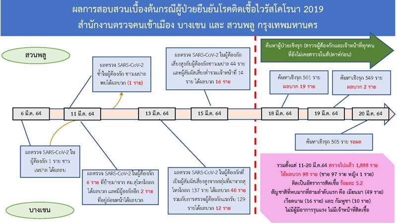เมื่อเวลา 11.30 น.วันที่ 22 มีนาคม 2564 ที่ทำเนียบรัฐบาล พญ.อภิสมัย ศรีรังสรรค์ ผู้ช่วยโฆษกศูนย์บริหารสถานการณ์การแพร่ระบาดของโรคติดเชื้อไวรัสโคโรนา 2019 (โควิด-19) หรือ ศบค.แถลงสถานการณ์ประจำวัน (อ่านข่าวที่เกี่ยวข้อง : ศบค.เผยไทยติดเชื้อ'โควิด'เพิ่ม 73 ราย เสียชีวิตเพิ่ม 1 ราย) ตอนหนึ่ง ว่า ในส่วนของผู้ต้องกักในห้องกักของสำนักงานตรวจคนเข้าเมือง (สตม.) ทั้งที่บางเขน และสวนพลู นั้น ตั้งแต่วันที่ 11-20 มีนาคม 2564 มีการตรวจหาเชื้อแล้ว 1,888 ราย ปรากฏว่ายืนยันเป็นผลบวก 98 ราย หรือคิดเป็น 5.2% แต่ล่าสุดจากการประชุม ศบค.ช่วงเช้าวันนี้ ตัวเลขรายงานล่าสุด Active Case Finding เมื่อวันที่ 20 มีนาคม 2564 เพิ่มขึ้นอีก 297 ราย โดยพบว่าผู้ติดเชื้อส่วนใหญ่ลักลอบเดินทางข้ามประเทศเข้ามา และถูกจับได้จากทั่วประเทศ จากนั้นนำตัวมาไว้ที่ห้องกักของ สตม. ที่บางเขน และสวนพลู โดยมีทั้งชาวเมียนมา เวียดนาม และกัมพูชา