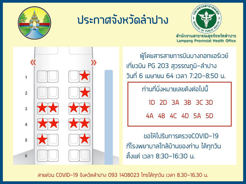 โดยท่านที่นั่งหมายเลขดังต่อไปนี้ 1D , 2D , 3A , 3B , 3C , 3D , 4A , 4B , 4C , 4D , 5A และ 5D ขอให้ไปรับการตรวจโควิด-19 ที่โรงพยาบาลใกล้บ้านของท่าน ได้ทุกวัน ตั้งแต่เวลา 08.30 - 16.30 น.