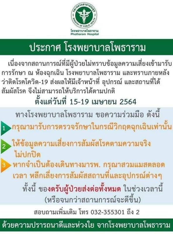 โรงพยาบาลโพธาราม จังหวัดราชบุรี ประกาศงดรับบริการห้องฉุกเฉิน และงดรับผู้ป่วยส่งต่อทั้งหมด หลังพบบุคลากรทางการแพทย์ติดเชื้อโควิด -19