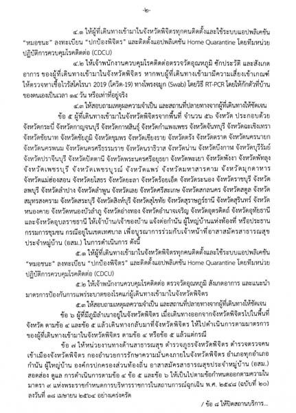 หนังสือคำสั่ง ระบุว่า กรณีประชาชนทั่วไปทุกคนจากทุกจังหวัดที่เดินทางเข้าพิจิตร ต้องลงทะเบียนผ่านลิงค์ ปกป้องพิจิตร ติดตั้งใช้งานแอป หมอชนะ และHome Quarantine ผู้เดินทางจาก 20 จังหวัด ได้แก่ กรุงเทพ ขอนแก่น ชลบุรี เชียงใหม่ ตาก นครปฐม นครราชสีมา นนทบุรี ปทุมธานี ประจวบคีรีขันธ์ ภูเก็ต ระยอง สงขลา สมุทรปราการ สมุทรสาคร สระแก้ว สุพรรณบุรี อุดรธานีนครสวรรค์ และจังหวัดพิษณุโลก ต้องลงทะเบียนผ่านลิงค์ ปกป้องพิจิตร รายงานตัวกับกำนัน ผู้ใหญ่บ้าน อสม.ในพื้นที่กักตัวอยู่บ้านตามวันเวลาที่อยู่จริง
