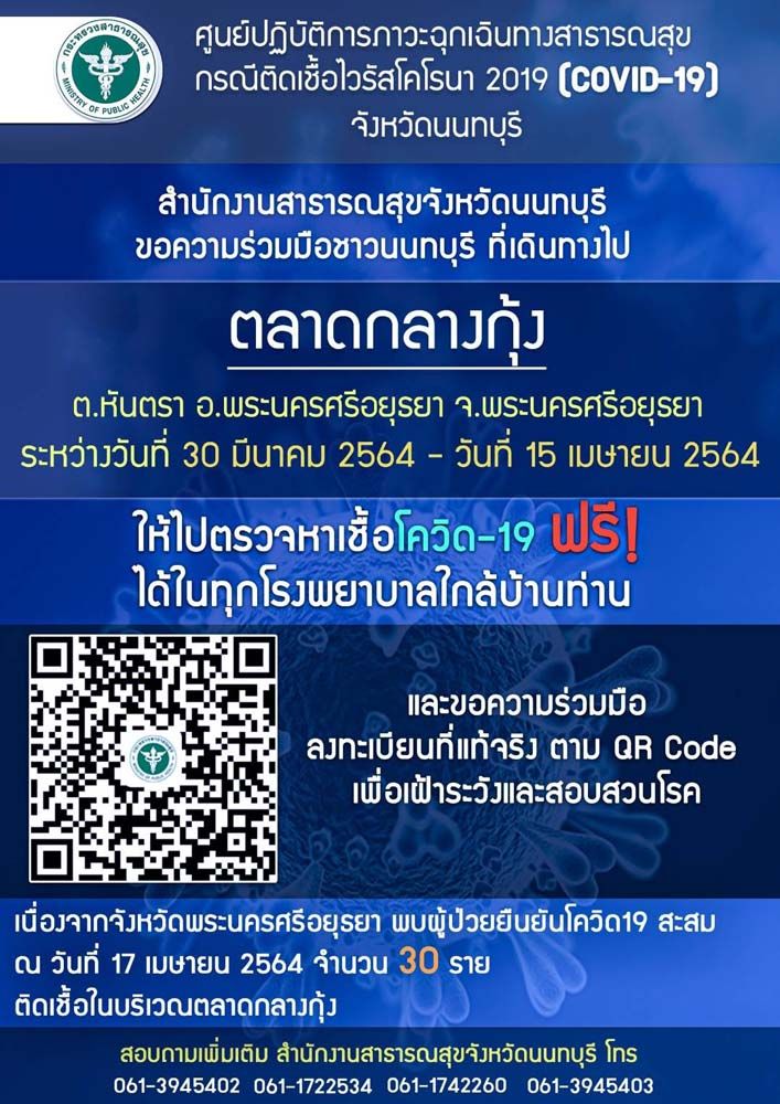18 เม.ย.64 สำนักงานสาธารณสุขจังหวัดนนทบุรี ขอความร่วมมือชาวนนทบุรีที่เดินทางไป ตลาดกลางกุ้ง ต.หันตรา อ.พระนครศรีอยุธยา จ.พระนครศรีอยุธยา ระหว่างวันที่ 30 มีนาคม 2564 - วันที่ 15 เมษายน 2564 ให้ไปตรวจหาเชื้อ COVID-19 ฟรี ได้ในทุกโรงพยาบาลใกล้บ้านท่าน และขอความร่วมมือลงทะเบียนที่แท้จริงตาม QR CODE เพื่อเฝ้าระวังและสอบสวนโรค เนื่องจากจังหวัดพระนครศรีอยุธยา พบผู้ป่วยยืนยันโควิด-19 สะสม ณ วันที่ 17 เมษายน 2564 จำนวน 30 ราย ติดเชื้อในบริเวณตลาดกลางกุ้ง อ่านข่าวที่เกี่ยวข้อง : สั่งปิดตลาดกลางกุ้งอยุธยา 'คลัสเตอร์โควิด-19' แพร่เชื้อแล้วไม่ต่ำ 17 ราย