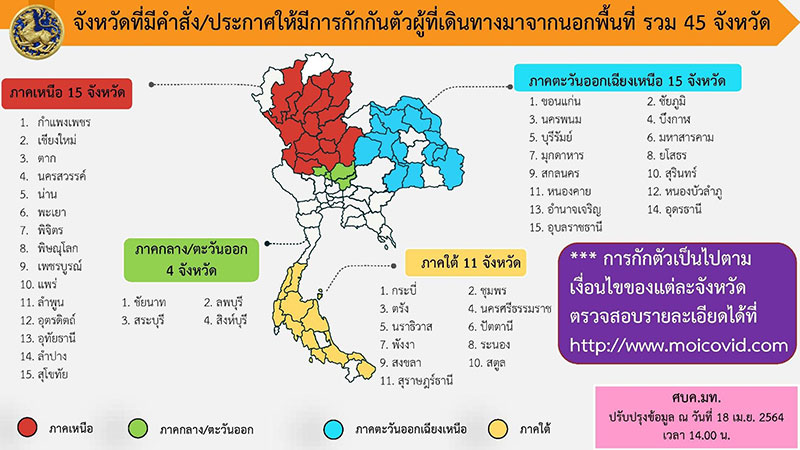 เมื่อเวลา 15.18 น.วันที่ 18 เมษายน 2564 ศูนย์บริหารสถานการณ์การแพร่ระบาดของโรคติดเชื้อไวรัสโคโรนา 2019 กระทรวงมหาดไทย (ศบค.มท.) ได้เปิดเผยจังหวัดที่มีคำสั่ง/ประกาศให้มีการกักกันตัวผู้ที่เดินทางมาจากนอกพื้นที่เพิ่มเติมล่าสุด จากข้อมูลวันนี้ (18 เม.ย.) เวลา 14.00 น.รวม 45 จังหวัด ได้แก่