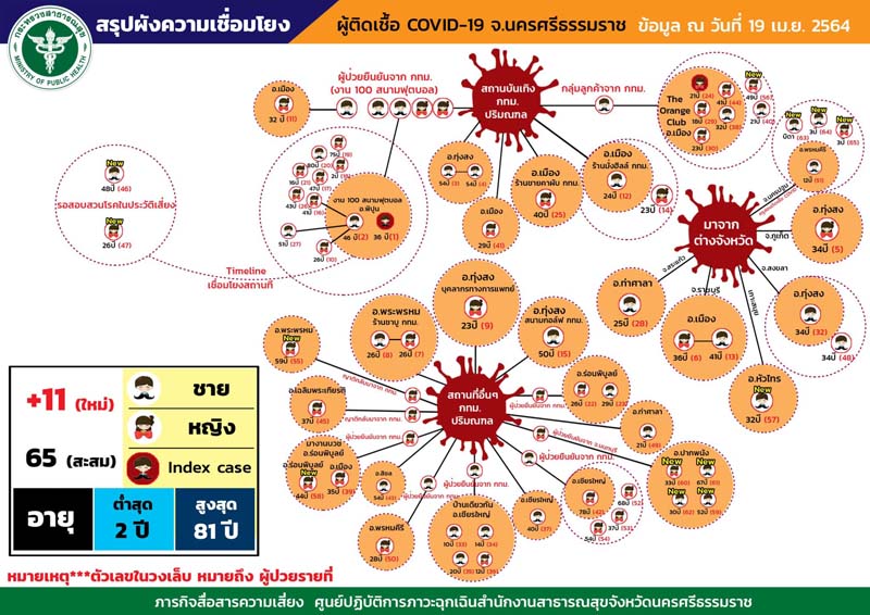 นอกจากนี้ทางสำนักงานสาธารณจังหวัดนครศรีธรรมราช ยังสรุปไทม์ไลน์สถานที่ต่างๆ ที่ผู้ป่วยติดเชื้อเดินทางไปพร้อมแจ้งให้ผู้ที่เคยไปหรือสัมผัสผู้ป่วยติดเชื้อตามไทมไลน์ที่ระบุ ให้กักตัวเองจำนวน 14 วัน พร้อมกับสังเกตอาการ หากพบว่ามีอาการเสี่ยงที่จะติดเชื้อโควิด- 19 ให้รีบเข้ารับการตรวจหรือรักษาที่โรงพยาบาลใกล้บ้าน ทำมีล่าสุดทำให้สถานการณ์การแพร่ระบาดไวรัสโควิด -19 ระลอกใหม่ เดือนเมษายน จังหวัดนครศรีธรรมราช มีผู้ป่วยติดเชื้อไวรัสโควิด – 19 แล้ว จำนวน 65 ราย