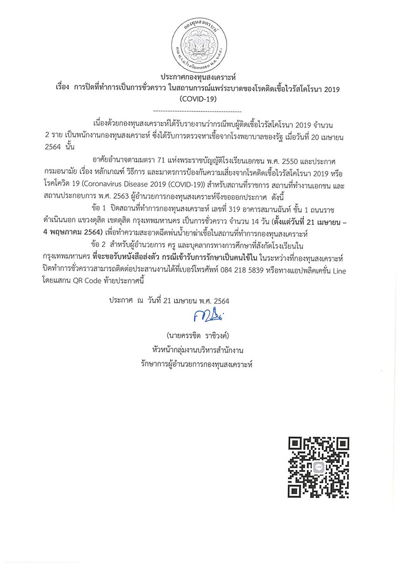 ทั้งนี้ ที่ทำการกองทุน ซึ่งตั้งอยู่ที่อาคารสมานฉันท์ ชั้น 1 กระทรวงศึกษาธิการ หากผู้อำนวยการ ครู และบุคลากรทางการศึกษา ที่สังกัดโรงเรียนในกรุงเทพฯ ที่จะขอรับหนังสือส่งตัว กรณีเข้ารับการรักษาเป็นคนไข้ใน ในระหว่างที่กองทุนฯ ปิดทำการชั่วคราว สามารถติดต่อได้ที่ โทร. 084 218 5839 หรือแอปพลิเคชัน Line ตาม QR Code