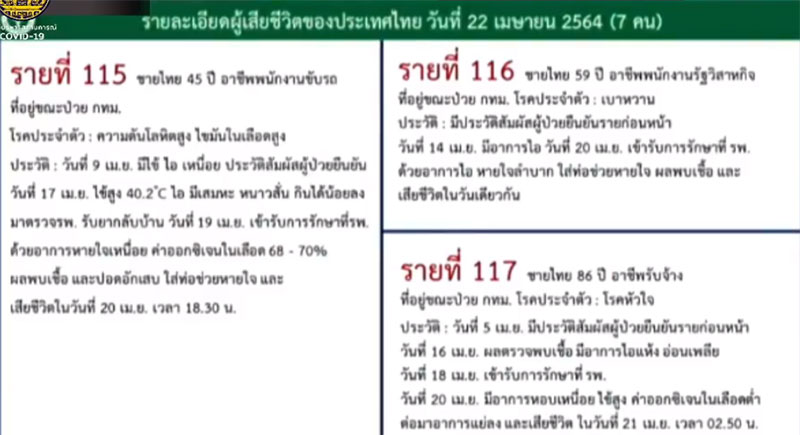 เมื่อวันที่ 22 เมษายน 2564 ที่ทำเนียบรัฐบาล นพ.ทวีศิลป์ วิษณุโยธิน โฆษกศูนย์บริหารสถานการณ์การแพร่ระบาดของโรคติดเชื้อไวรัสโคโรนา 2019 (โควิด-19) หรือ ศบค.แถลงสถานการณ์ประจำวัน ตอนหนึ่งว่า สำหรับวันนี้มีรายงานผู้เสียชีวิตเพิ่มเติม 7 ราย ยอดผู้เสียชีวิตสะสม 117 ราย (อ่านข่าวที่เกี่ยวข้อง : ด่วน!!! ดับเซ่น'โควิด'วันเดียว 7 ราย พบผู้ป่วยใหม่ 1,470 ราย) โดยไทม์ไลน์ผู้เสียชีวิต 7 ราย มีดังนี้