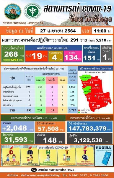 27 เมษายน 2564 สำนักงานสาธารณสุขจังหวัดพัทลุง รายงานสถานการณ์การแพร่ระบาดของเชื้อไวรัสโควิด-19 ในจังหวัดพัทลุง วันที่ 27 เมษายน 2564 ว่า จากการนำผู้ใกล้ชิดและผู้สัมผัสกับผู้ป่วยไปตรวจหาสารคัดหลั่ง 291 ราย ผลจากการตรวจพบผู้ติดเชื้อรายใหม่เพิ่มอีก 19 ราย เป็นผู้ป่วยในพื้นที่ อ.เมืองพัทลุง 9 ราย อ.ปากพะยูน 2 ราย อ.ป่าบอน 8 ราย และกำลังรอผลตรวจอีก 4 ราย