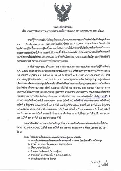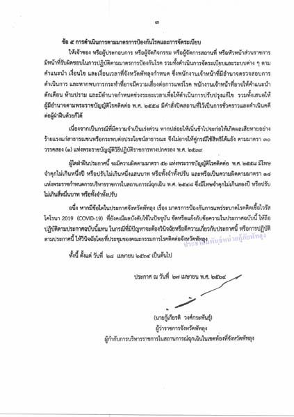 ด้านนายกู้เกียรติ วงค์กระพันธ์ ผวจ.พัทลุง กล่าวว่า จากสถานการณ์การแพร่ระบาดของโรคโควิด 19 ในปัจจุบันพบการติดเชื้อสะสม และผู้ติดเชื้อรายใหม่เพิ่มจำนวนขึ้นอย่างต่อเนื่อง ทั้งประชาชนส่วนหนึ่งในจังหวัดพัทลุงยังไม่สวมหน้ากากอนามัยหรือหน้ากากผ้า ก่อให้เกิดสภาวะที่ไม่ถูกสุขลักษณะซึ่งเป็นสาเหตุหนึ่งที่ทำให้เกิดการแพร่ระบาดของโรค