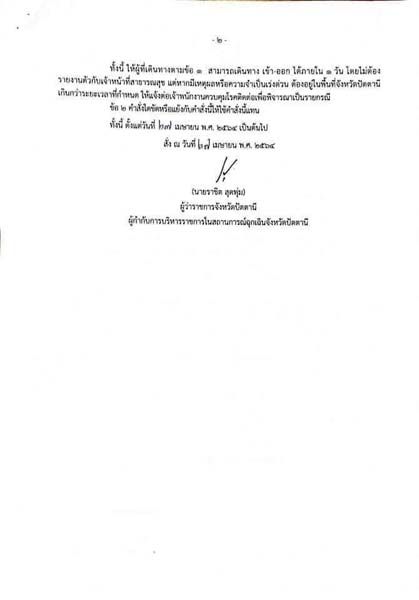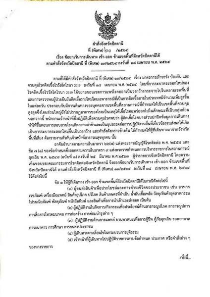 28 เมษายน 2564 นายราชิต สุดพุ่ม ผู้ว่าราชการจังหวัดปัตตานี (ผวจ.ปัตตานี) ออกคำสั่งจำกัดบุคคลเดินทางเข้า-ออก จังหวัดปัตตานี โดยสั่ง ณ วันที่ 27 เมษายน 2564 มีการผ่อนผันสำหรับกรณีผู้ที่เดินทางเข้า-ออก ข้ามเขตพื้นที่จังหวัดปัตตานี ได้ในกรณีดังต่อไปนี้