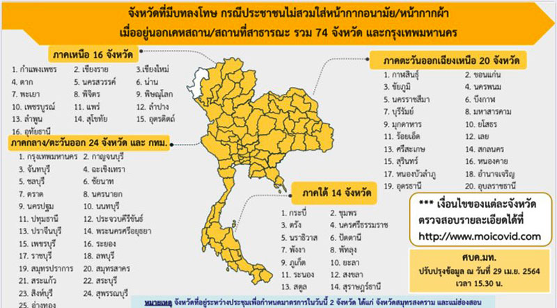 ศบค.มท. Update ! ข้อมูล ณ 28 เม.ย.64 เวลา 09.20 น. สำหรับ 73 จังหวัด พื้นที่ (73 จังหวัด + กทม.) ที่มีบทลงโทษ กรณีประชาชนไม่ใส่แมสก์ “หน้ากากอนามัย- หน้ากากผ้า” เมื่ออยู่นอกเคหสถาน สถานที่สาธารณะ เพิ่ม จังหวัดอุทัยธานี และราชบุรี