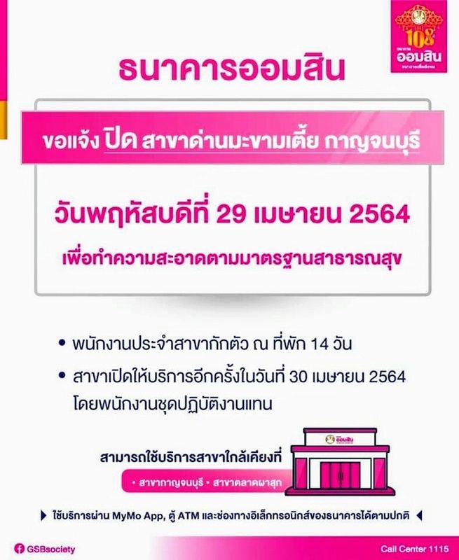 วันนี้ (29 เม.ย.64) เพจธนาคารออมสิน สาขาด่านมะขามเตี้ย จังหวัดกาญจนบุรี ได้โพสต์ข้อความ ระบุว่า "แจ้งเหตุการณ์ปิดธนาคารออมสินสาขาด่านมะขามเตี้ย กาญจนบุรี วันที่ 29 เมษายน 2564 เนื่องจากพบผู้ติดเชื้อ COVID-19 โดยธนาคารได้ดำเนินการดังนี้ 1.ทำความสะอาดตามมาตรฐานสาธารณสุข 2.ให้พนักงานเข้ารับการตรวจหาเชื้อและให้กักตัวเฝ้าระวังสังเกตอาการตนเอง (Self-Quarantine) 14 วันทันที โดยส่งทีมพนักงานชุดใหม่เข้าปฏิบัติงานแทนในวันที่เปิดสาขาอีกครั้ง และ 3. ประกาศแจ้งให้ทราบทั่วกันทาง www.gsb.or.th พร้อมทั้งติดตามสถานการณ์การแพร่ระบาดในแต่ละพื้นที่เพื่อประเมินความเสี่ยงของการปฏิบัติงานอย่างใกล้ชิด