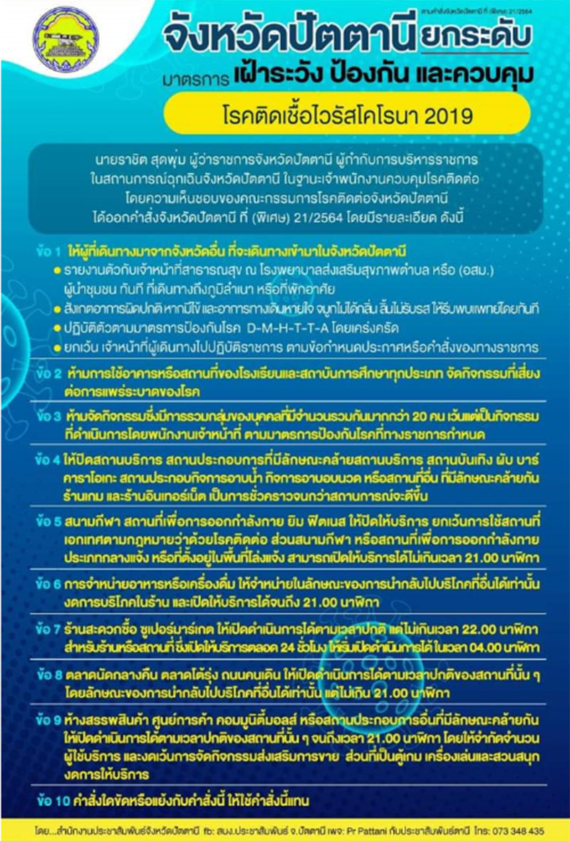 เมื่อวันที่ 3 พฤษภาคม 2564 จังหวัดปัตตานี เผยแพร่คำสั่งจังหวัดปัตตานี ที่ (พิเศษ) 21/2564เข้ม เรื่อง มาตรการเฝ้าระวัง ป้องกัน และควบคุมโรคติดเชื้อไวรัสโคโรนา 2019 ข้อกำหนดออกตามความในมาตรา 9 แห่งพระราชกำหนดการบริหารราชการในสถานการณ์ฉุกเฉิน พ.ศ.2548 (ฉบับที่ 22) ลงวันที่ 29 เมษายน พ.ศ.2564 โดยที่โรคติดเชื้อไวรัสโคโรนา 2019 ได้เกิดการระบาดระลอกใหม่ขึ้น มีผู้ติดเชื้อรายวันและผู้เสียชีวิตเพิ่มขึ้นเป็นจำนวนมาก ประกอบกับ จังหวัดปัตตานี มีผู้ป่วยยืนยันสะสมเพิ่มสูงขึ้น พบผู้ป่วยรายใหม่ทุกวัน จึงส่งผลกระทบต่อความปลอดภัยและการดำรงชีวิตโดยปกติสุขของประชาชน และต่อระบบการให้บริการทางการแพทย์และสาธารณสุข กรณีดังกล่าวมีความจำเป็นอย่างยิ่งที่จะต้องกำหนดมาตรการควบคุมการระบาดของโรคให้เข้มข้นกว่าเดิม เพื่อมิให้เหตุการณ์ระบาดของโรคติดเชื้อไวรัสโคโรนา 2019 อันเป็นสถานการณ์ฉุกเฉินทวีความร้ายแรงมากขึ้น และให้สามารถยุติลงได้โดยเร็ว จึงให้ยกเลิกคำสั่งจังหวัดปัตตานี ที่ (พิเศษ) 17/2564 ลงวันที่ 18 เมษายน พ.ศ.2564 และคำสั่งจังหวัดปัตตานี ที่ (พิเศษ) 20/2564 ลงวันที่ 27 เมษายน พ.ศ. 2564 และให้ใช่คำสั่งนี้แทน